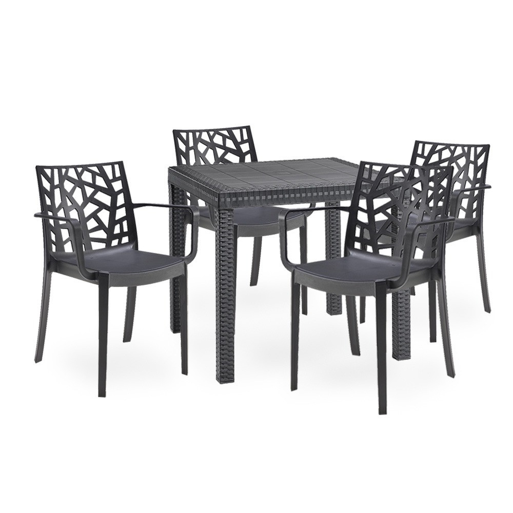 Transformă terasa, balconul sau grădina într-un spațiu primitor cu acest set mobilier de grădină Donato 4+1 de la Leziter. Cu un design modern în nuanță grafit, masă practică și 4 scaune cu cotiere, setul este potrivit pentru mese în aer liber, momente de relaxare sau întâlniri cu familia și prietenii.
