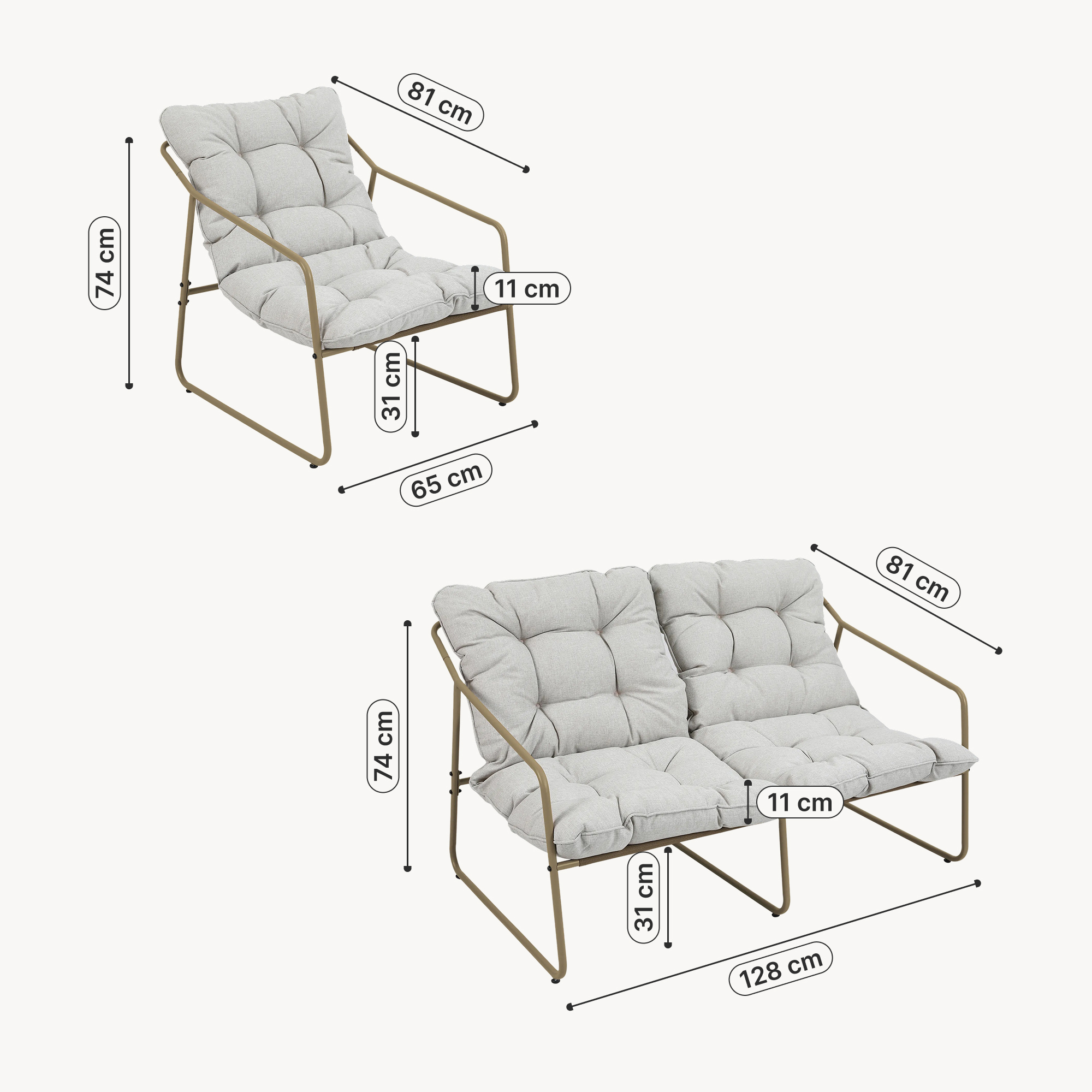 Setul include o canapea de 2 locuri, două fotolii și două măsuțe de dimensiuni diferite, oferind un ansamblu practic și armonios. Datorită designului modern în nuanțe de bej și pernelor groase, acest set de terasă îmbină aspectul elegant cu un nivel ridicat de confort.