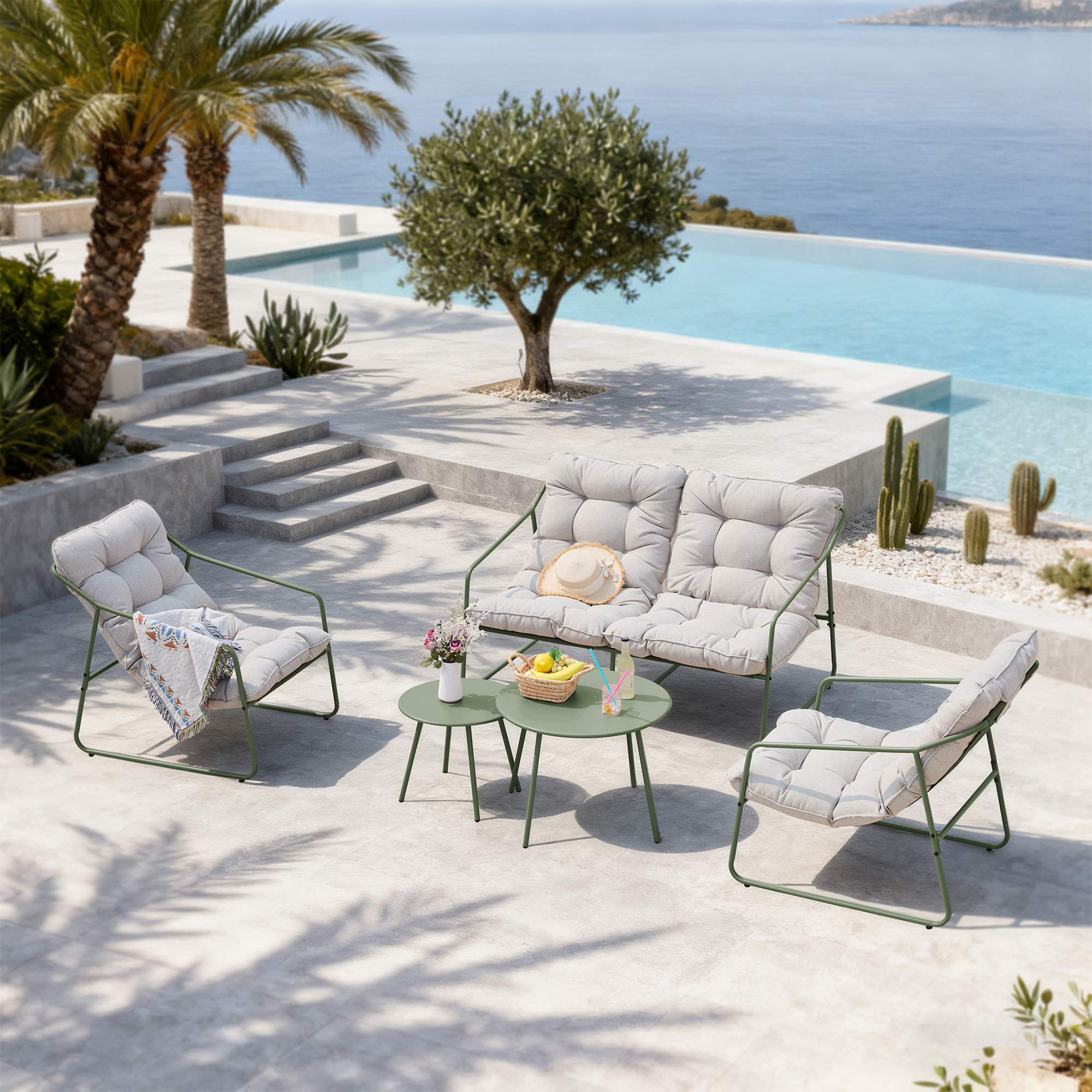 Setul de mobilier de grădină Kivanta 5 piese transformă rapid terasa, balconul sau grădina într-un spațiu primitor pentru relaxare. Cu un design modern, aerisit și o nuanță plăcută de verde deschis, acest set mobilier grădină este ideal pentru momente liniștite în aer liber, cafeaua de dimineață sau serile petrecute alături de cei dragi.