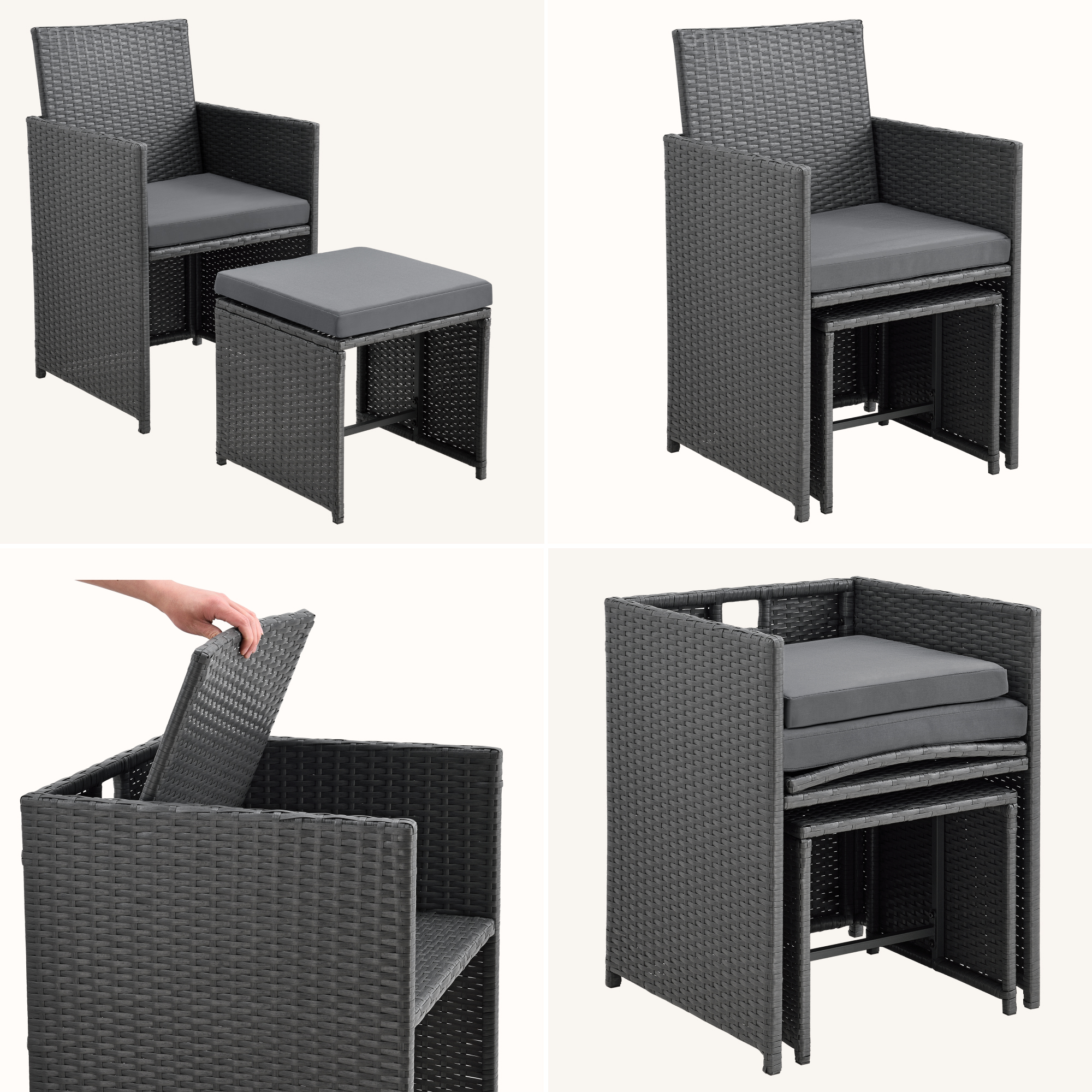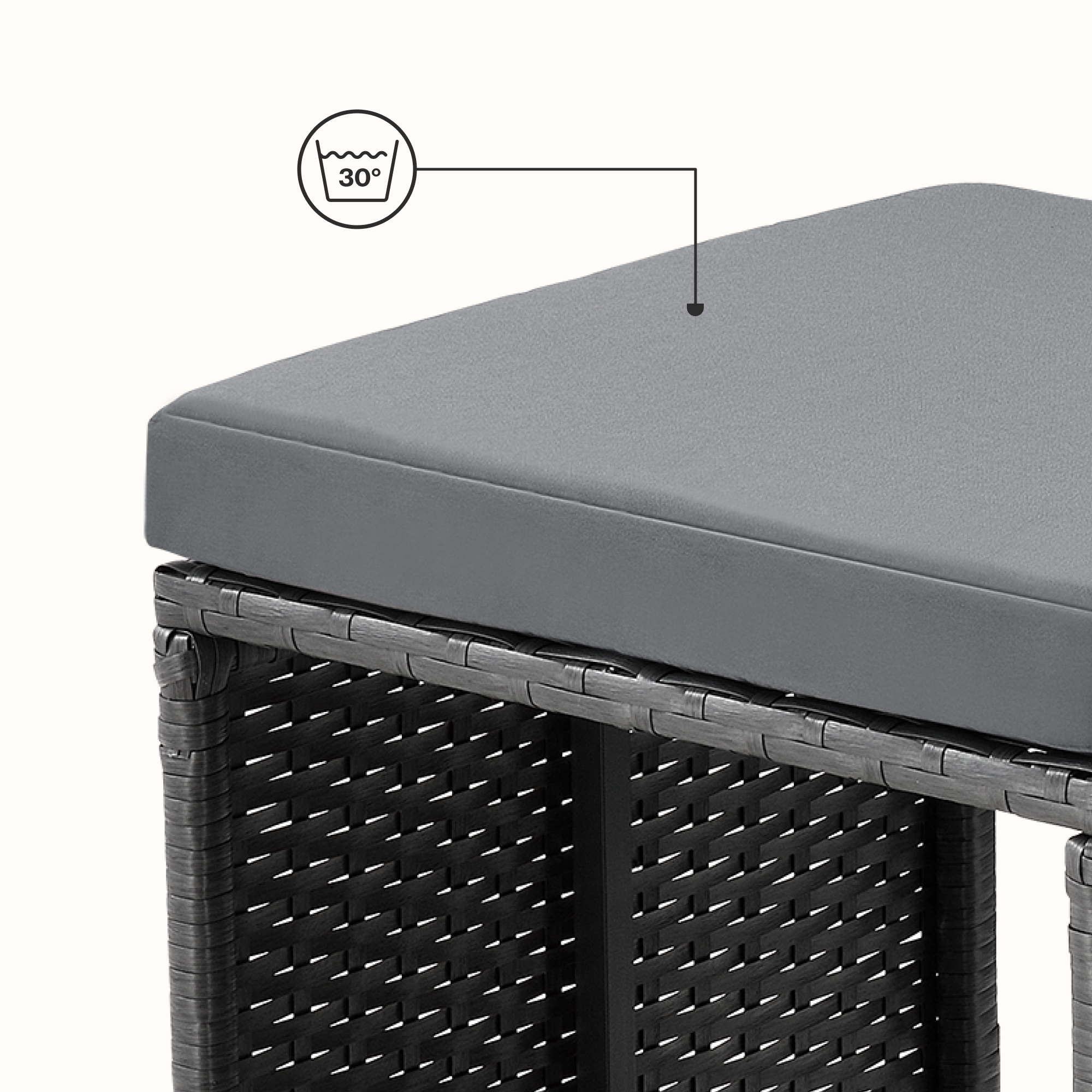 Scaunele sunt prevăzute cu spătar rabatabil, iar taburetele și scaunele pot fi depozitate compact sub masă, pentru a economisi spațiu atunci când nu sunt folosite. Pernele incluse sporesc confortul, iar husele detașabile se pot spăla la 30°C, pentru întreținere ușoară.