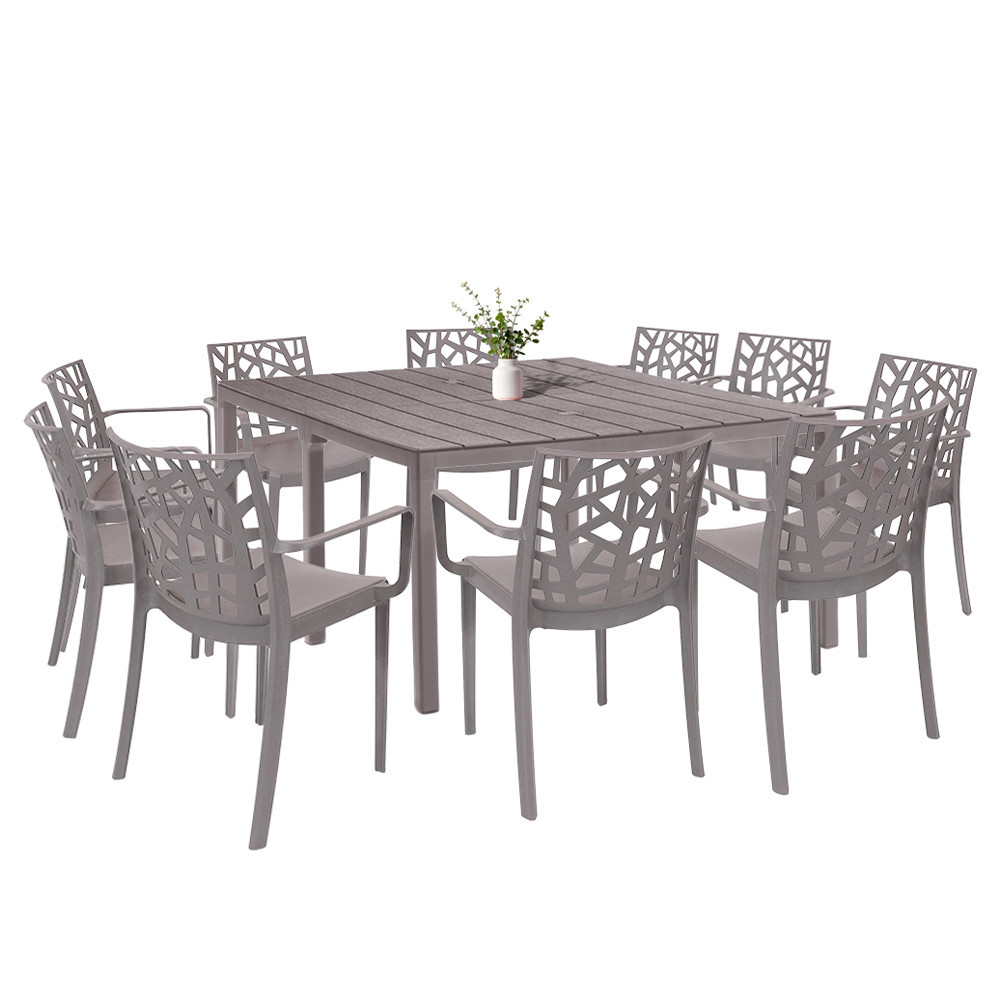 Transformă terasa sau grădina într-un spațiu primitor cu setul de mobilier de grădină Leziter Alina 10+1, o alegere practică și elegantă pentru mesele în familie, petrecerile în aer liber sau zonele de dining outdoor. Setul include 10 scaune cu cotiere și 1 masă extensibilă, într-o nuanță modernă cappuccino, ușor de integrat în decoruri clasice sau contemporane.