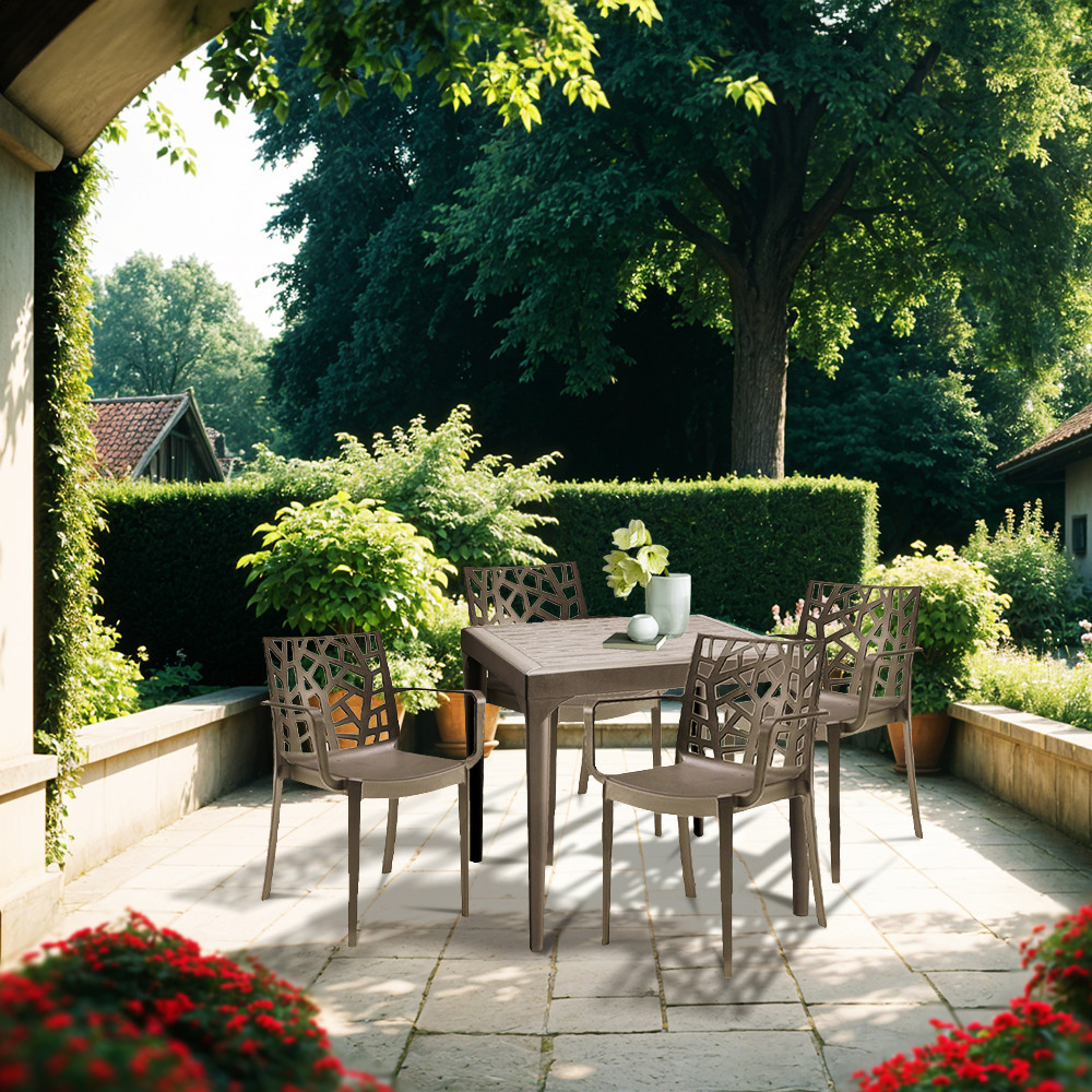 Realizat din plastic rezistent, acest set masă și scaune grădină este ușor de întreținut și potrivit pentru utilizare frecventă, atât în spații rezidențiale, cât și în zone HoReCa. Nuanța cappuccino și spătarele decorative decupate oferă un plus de stil, iar construcția durabilă îl recomandă pentru exterior pe termen lung.