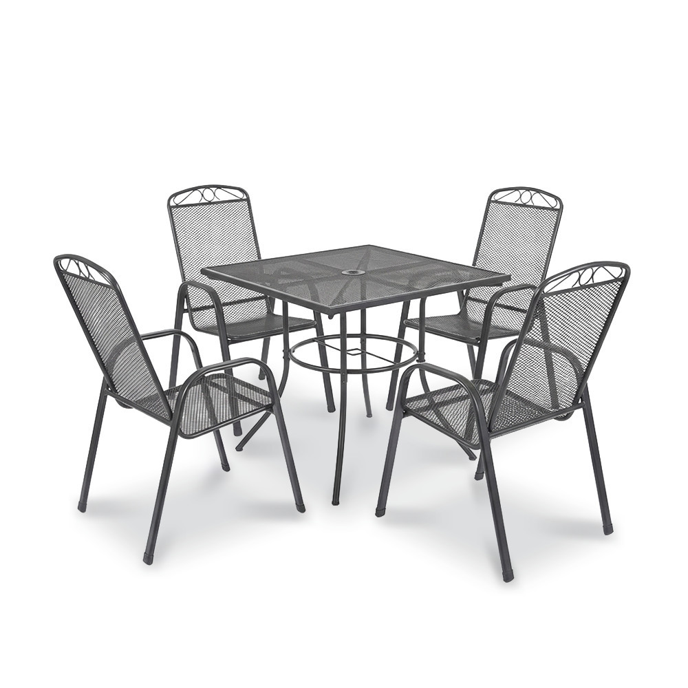 Construit pentru exterior, setul beneficiază de tratament anticoroziv și acoperire cu pulbere, ceea ce îl face potrivit pentru expunerea la intemperii. Suprafața din plasă metalică este aerisită, ușor de întreținut și practică în sezonul cald. În plus, masa este prevăzută cu deschidere pentru parasolar, un detaliu util pentru zilele însorite.