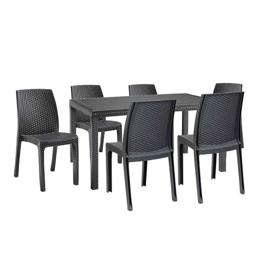 Setul de mobilier de grădină Leziter Hellda 6+1 este alegerea potrivită pentru terasă, curte sau balcon atunci când vrei confort, un aspect modern tip ratan și spațiu suficient pentru toți. În nuanță grafit, se integrează ușor în orice decor exterior și este ideal pentru mese în familie, întâlniri cu prietenii sau seri de vară la grătar.