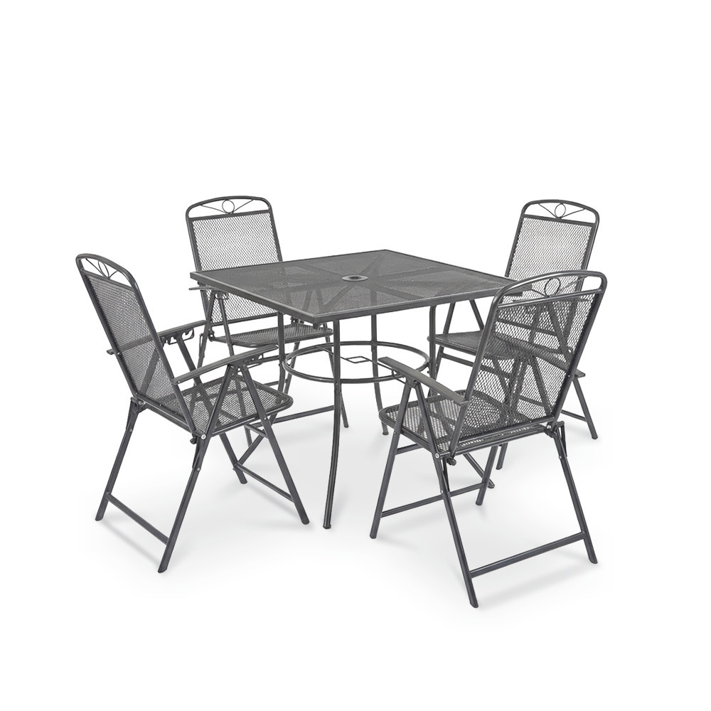 Setul include o masă de grădină pătrată și 4 scaune de grădină pliabile, ușor de integrat în amenajări exterioare moderne. Suprafața este tratată pentru rezistență la coroziune și intemperii, iar masa dispune de orificiu central pentru parasolar, oferind un plus de funcționalitate în zilele însorite.