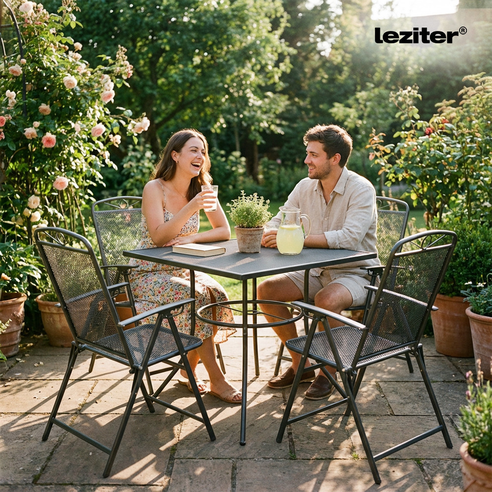 Setul de mobilier de grădină Leziter Mali 4+1 în culoarea antracit include o masă de grădină pătrată Melfi și 4 scaune de grădină pliabile Alba, cu structura sa robustă din oțel, finisajul rezistent la coroziune și acoperit cu pulbere și designul modern din plasă, oferă o soluție practică și elegantă pentru grădini, terase sau balcoane.