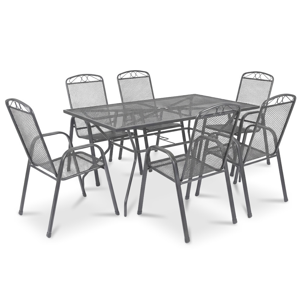 Designul din plasă metalică oferă un aspect modern și aerisit, iar suprafețele sunt ușor de întreținut. Scaunele cu brațe asigură confort la utilizare, iar sistemul pliabil ajută la depozitarea rapidă atunci când vrei să economisești spațiu. În plus, masa are deschidere pentru parasolar, utilă în zilele însorite.