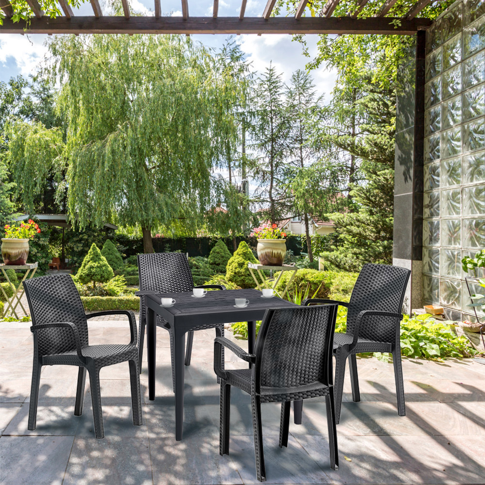 Setul de mobilier de grădină Leziter Natale 4+1, grafit este o alegere practică și elegantă pentru amenajarea unei terase, a unei grădini sau a unui spațiu exterior destinat meselor în familie. Designul modern, finisajul în nuanță grafit și aspectul inspirat de ratan îl fac ușor de integrat în decoruri contemporane, oferind în același timp confort și rezistență în utilizarea de zi cu zi.