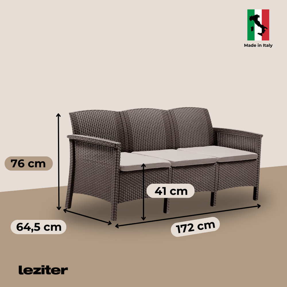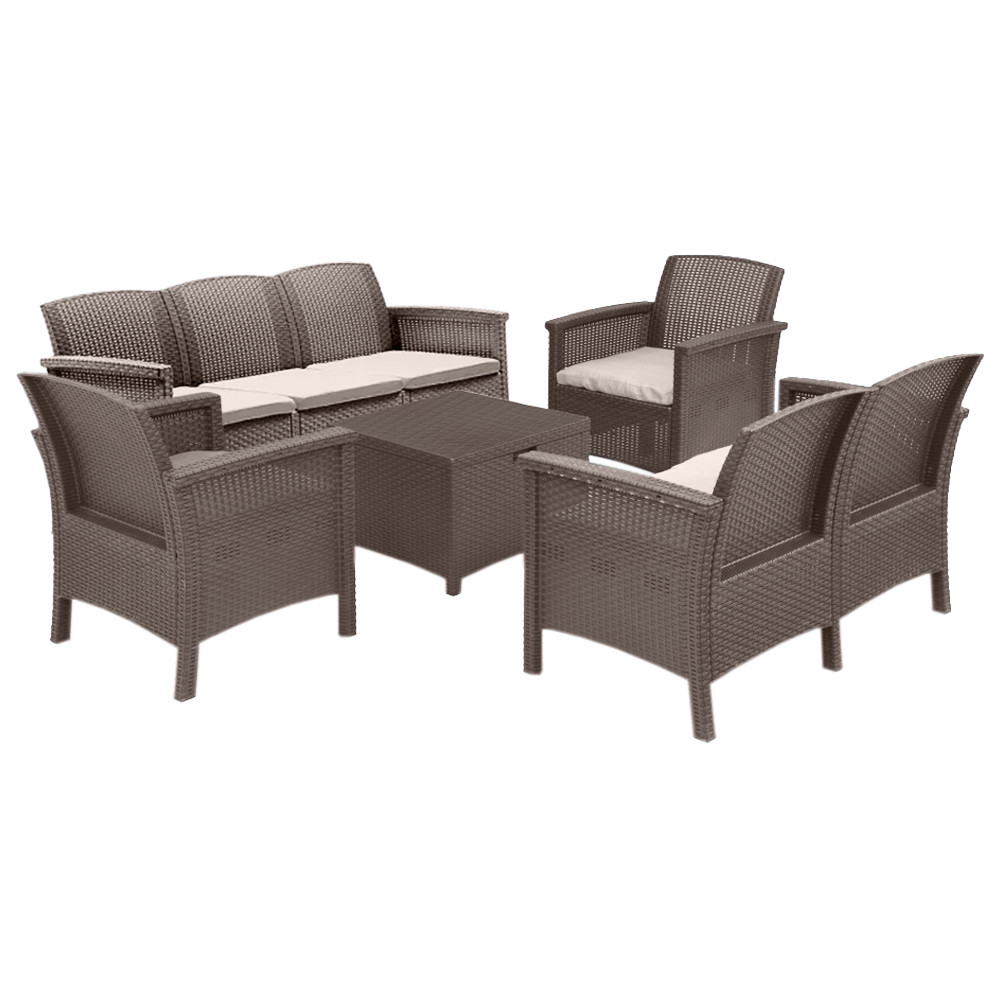 Setul include fotolii confortabile, o canapea pentru 2 persoane, o canapea pentru 3 persoane și o masă practică, potrivite pentru amenajarea unei zone primitoare în orice spațiu exterior. Nuanța maro se integrează ușor în decor, iar pernele deschise la culoare completează aspectul rafinat și confortul la utilizare.