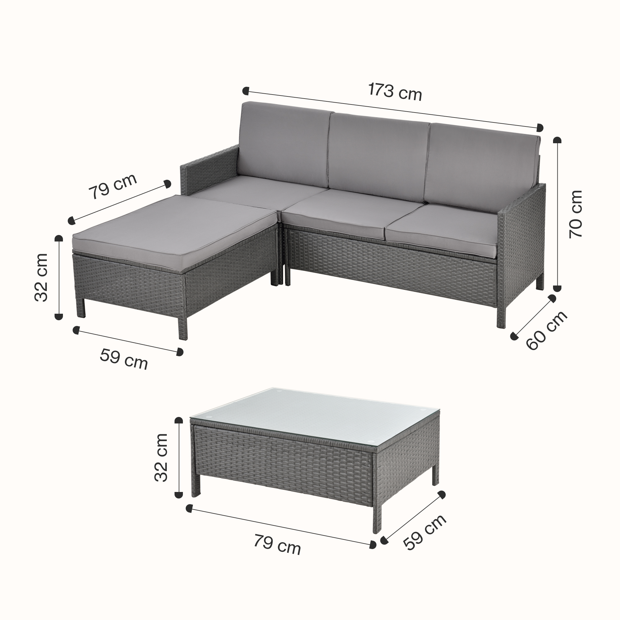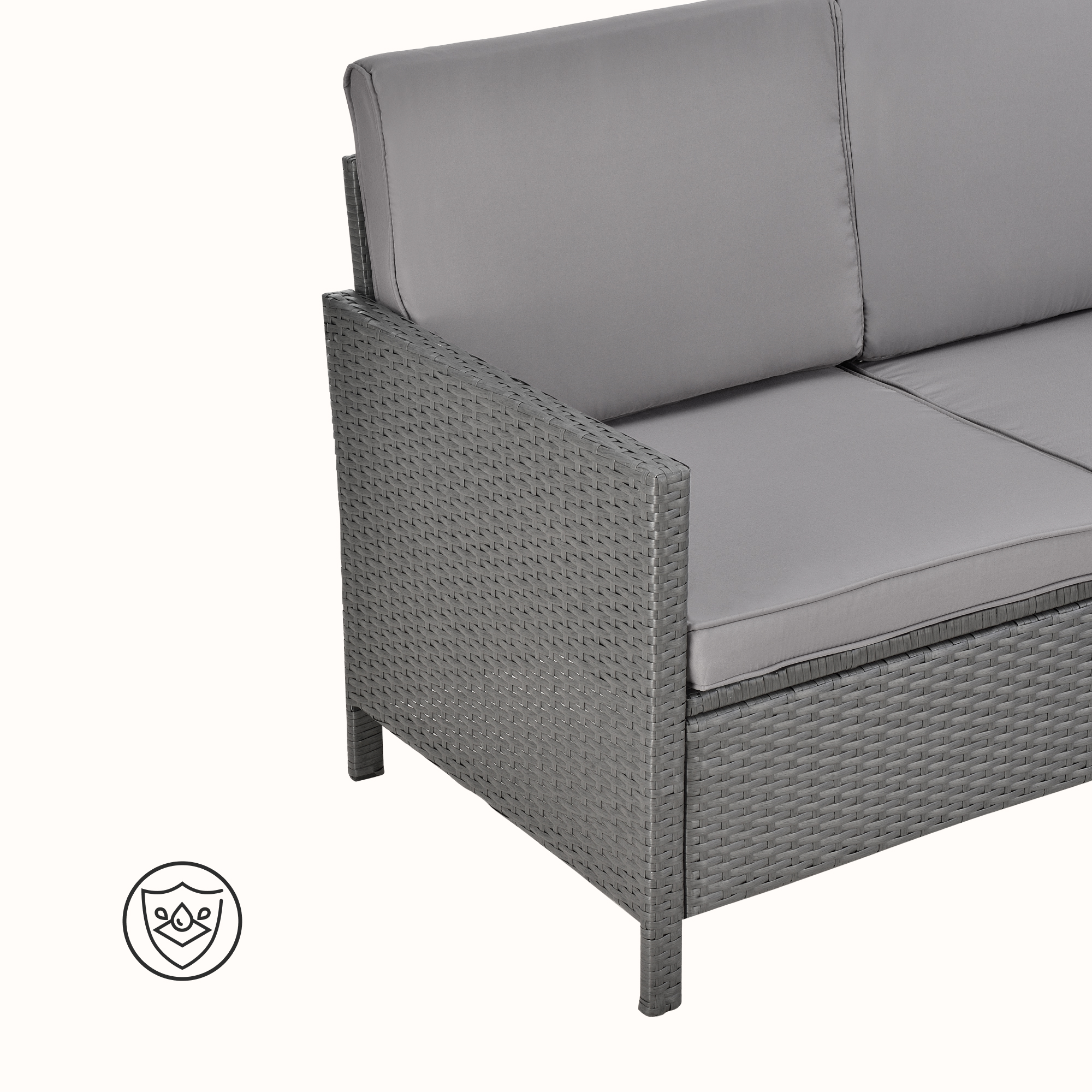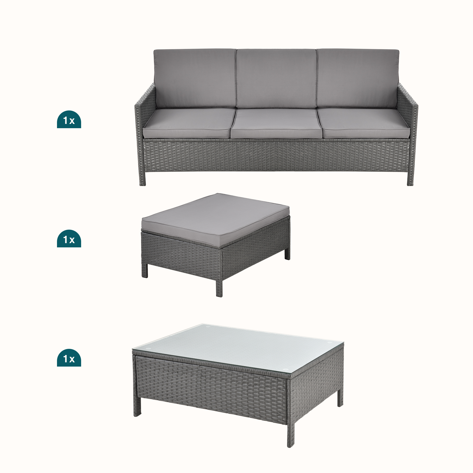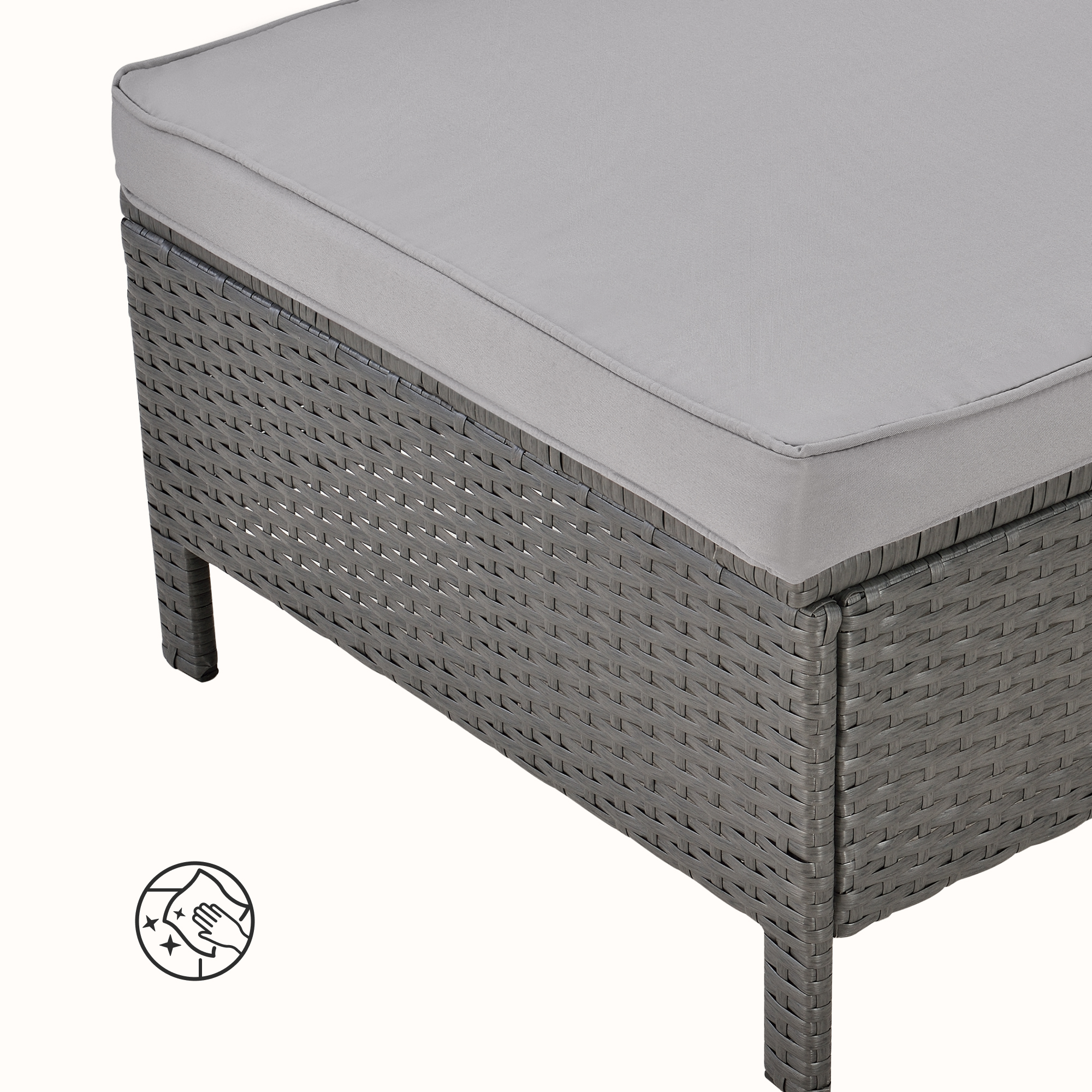 Datorită construcției din poliratan rezistent la intemperii și cadrului solid din oțel, setul este potrivit pentru utilizare zilnică în exterior. Pernele pentru șezut și spătar oferă un plus de confort, iar taburetul poate fi combinat cu sofa pentru a crea rapid o șezlong de grădină comodă și practică.