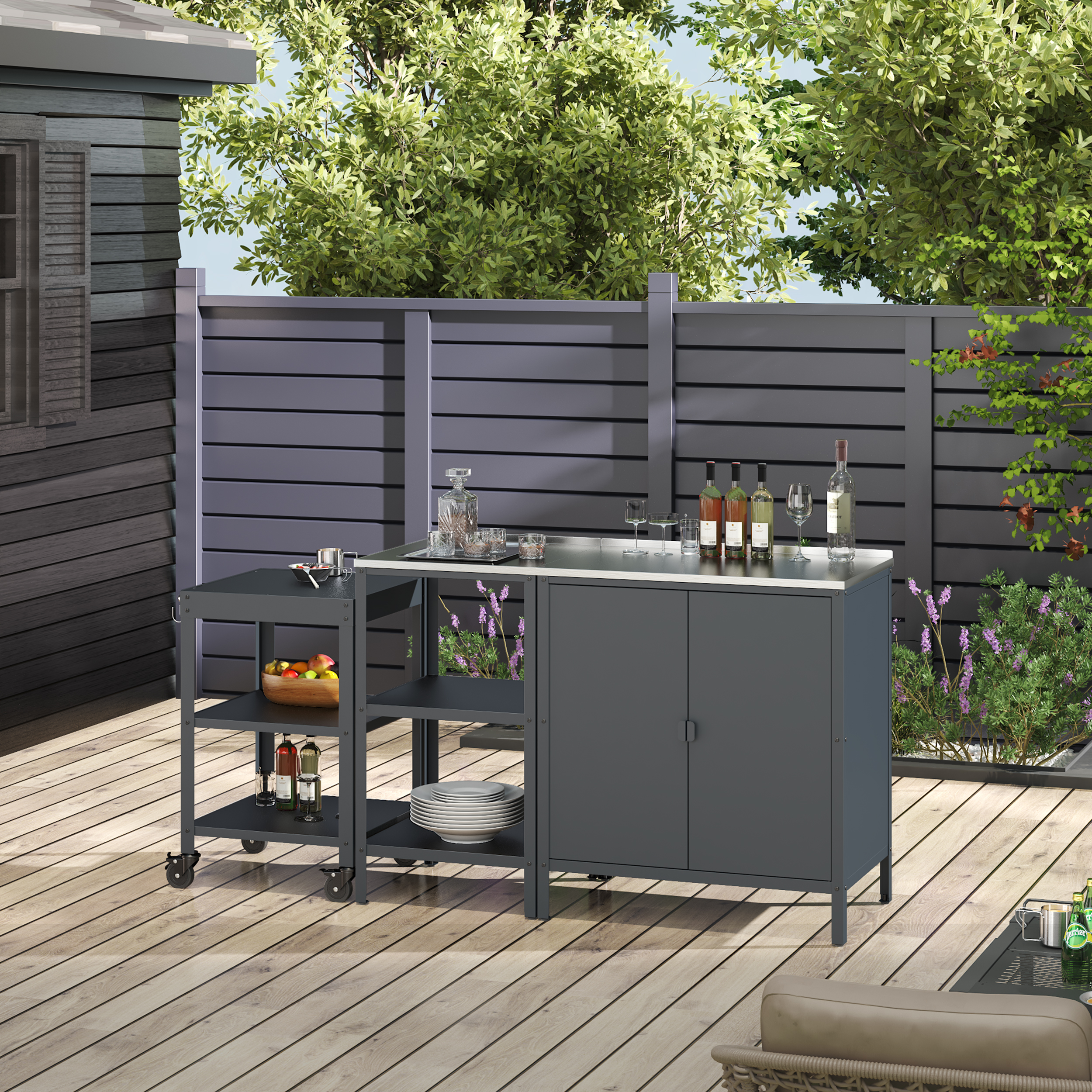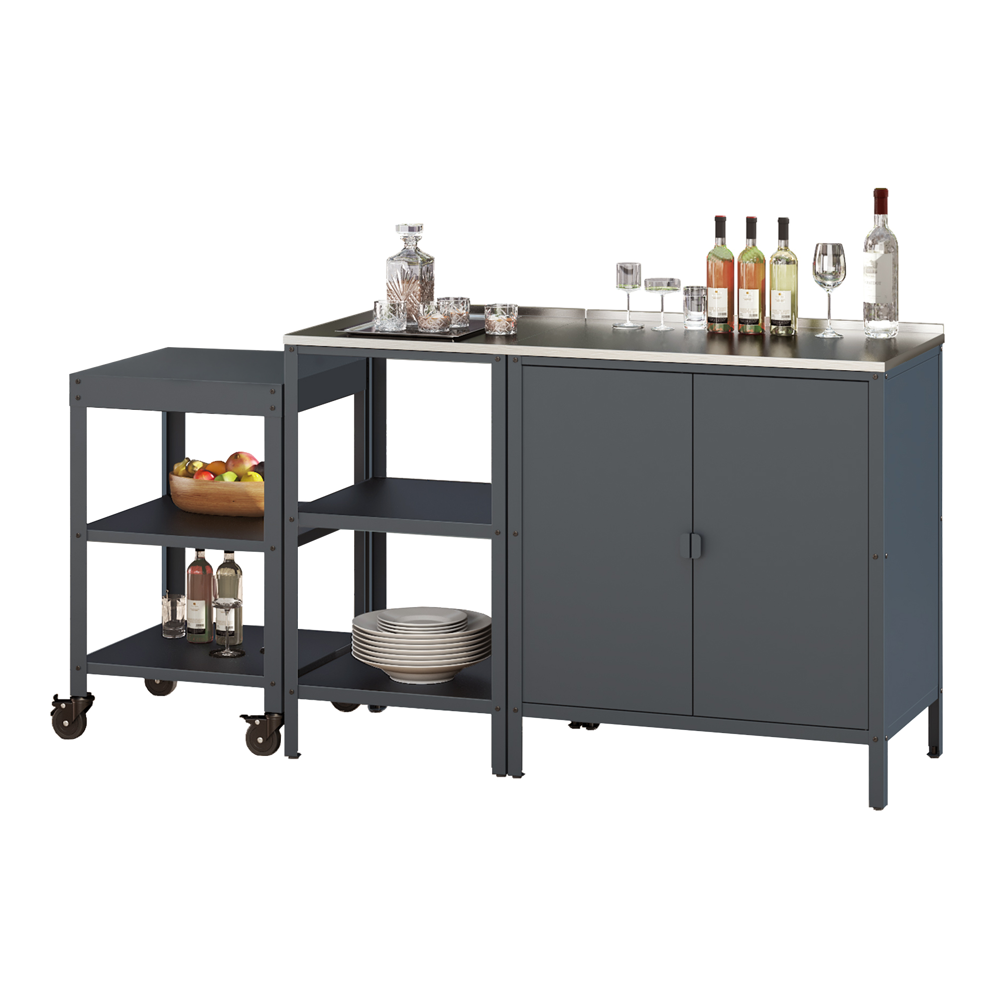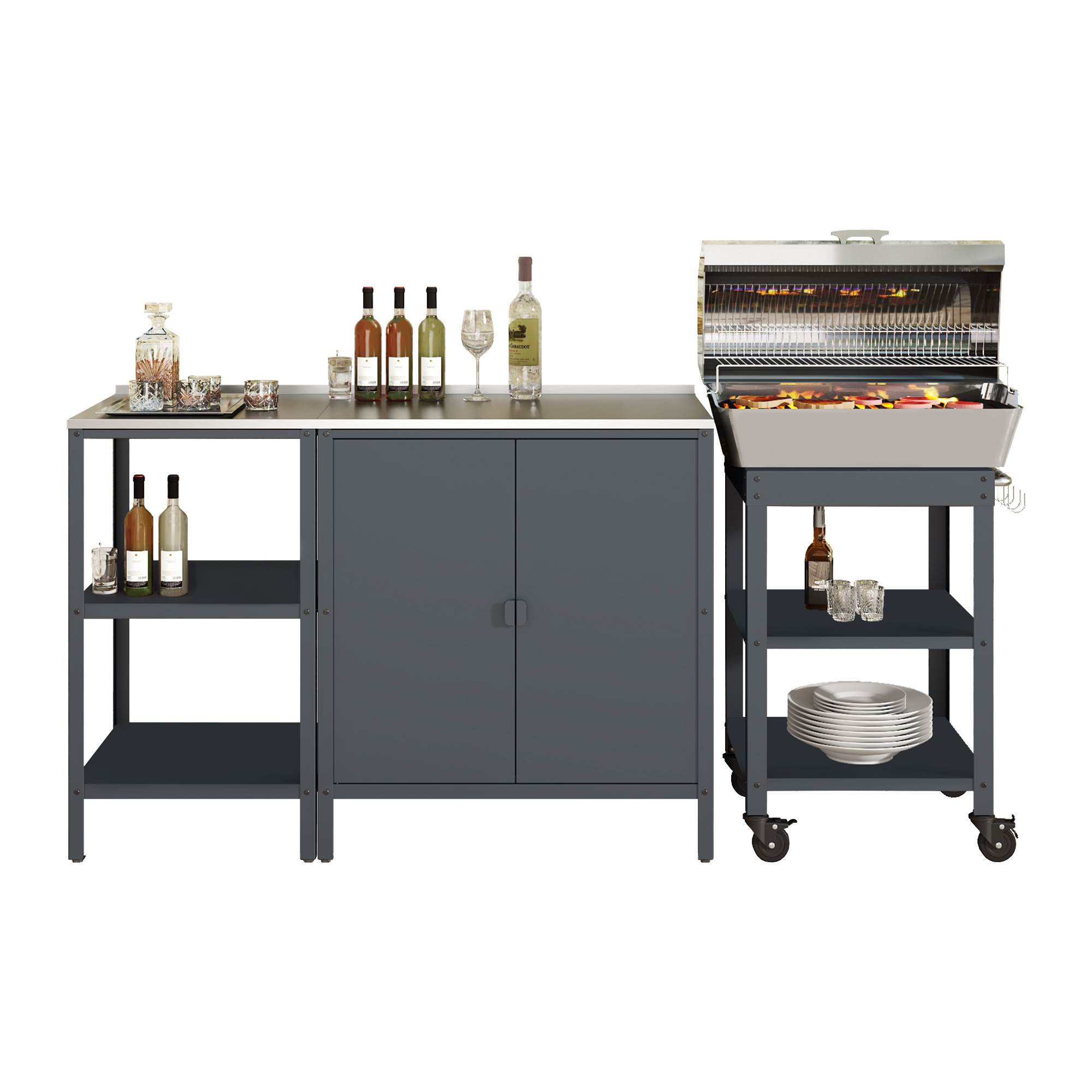 Realizat din otel vopsit electrostatic, setul este conceput pentru utilizare la exterior si are suprafete usor de curatat. Blaturile practice si rafturile incapatoare il fac ideal pentru petreceri in aer liber, zona de gratar sau amenajarea unui colt functional langa piscina.