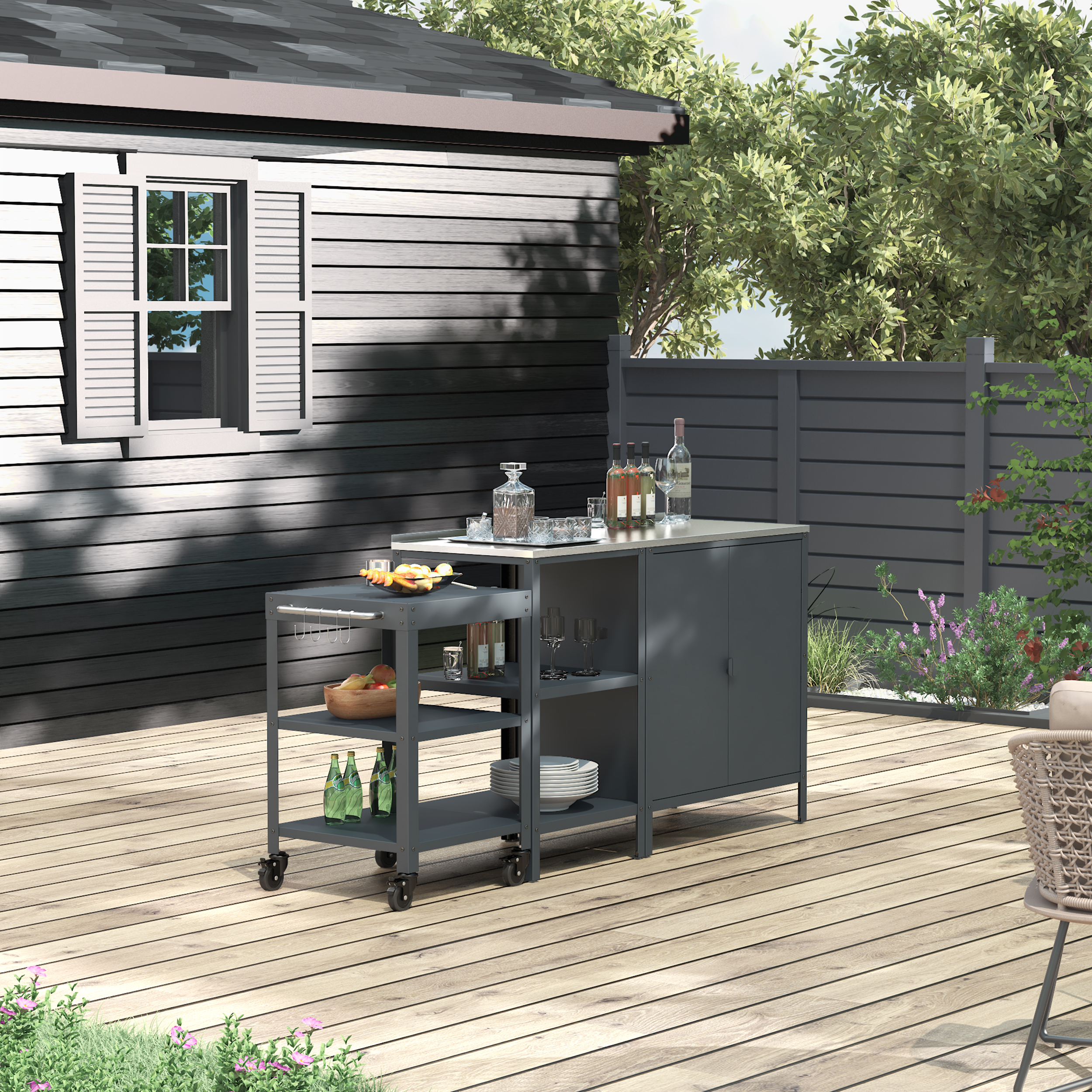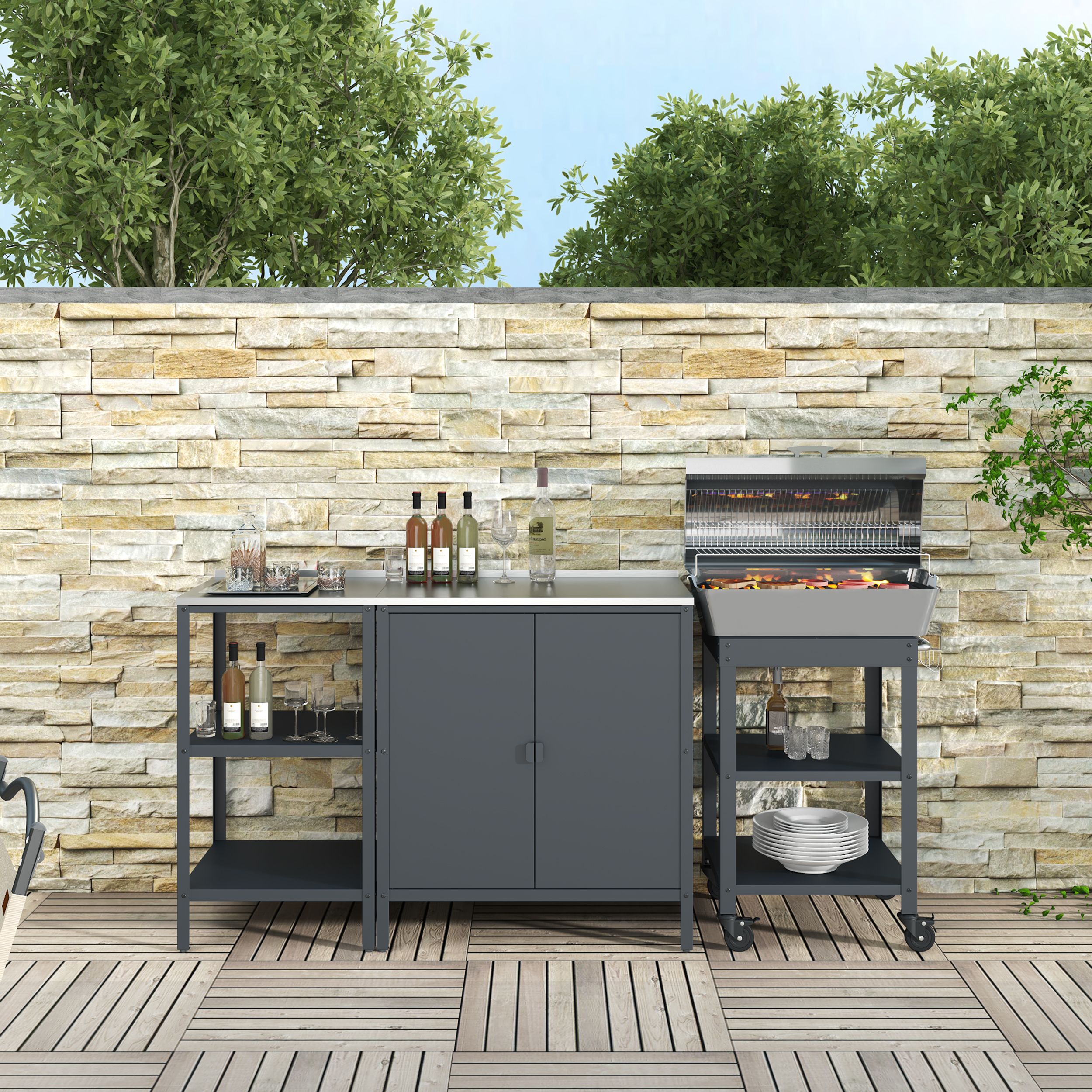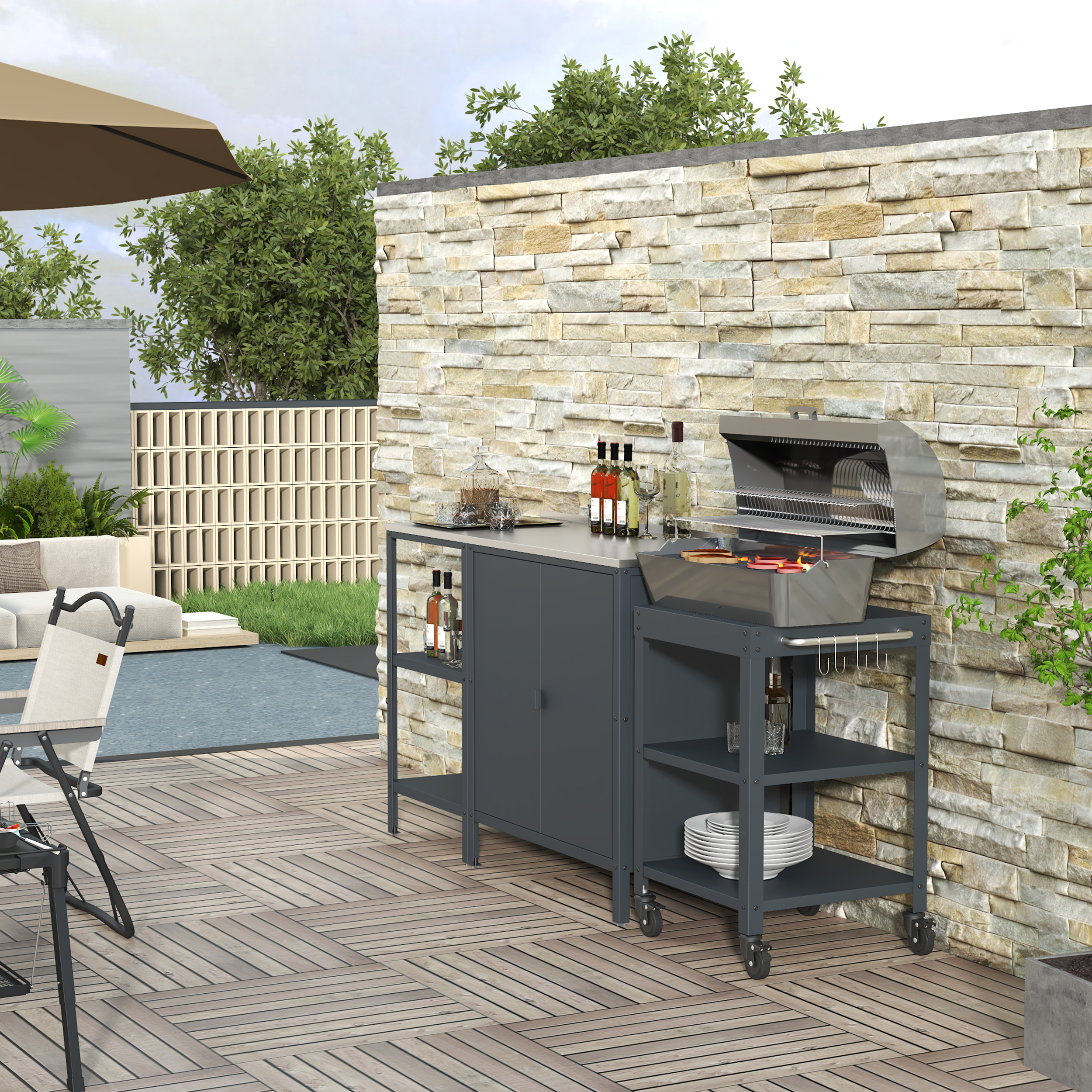 Realizat din otel vopsit electrostatic, setul este conceput pentru utilizare la exterior si are suprafete usor de curatat. Blaturile practice si rafturile incapatoare il fac ideal pentru petreceri in aer liber, zona de gratar sau amenajarea unui colt functional langa piscina.