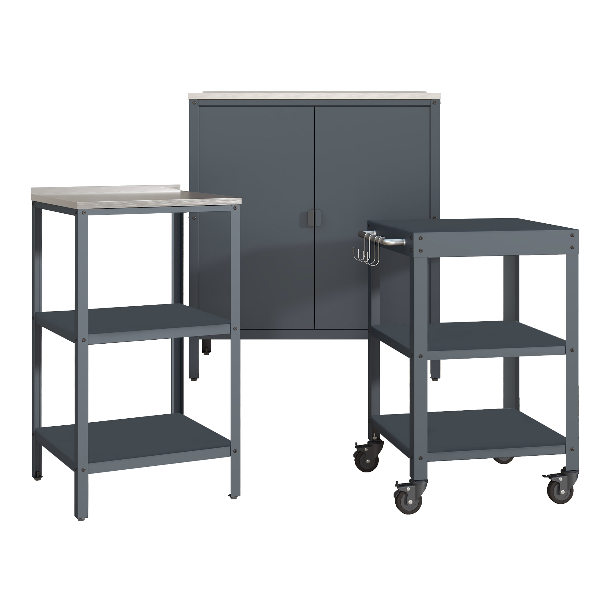 Setul de mobilier exterior Bolognano este alegerea potrivita pentru organizarea eficienta a spatiului din gradina, de pe terasa sau balcon. Compus din dulap, raft si carucior de servire, acest set ofera spatiu generos pentru depozitare, pregatirea gustarilor si servirea bauturilor, intr-un design modern, in nuanta gri inchis mat.