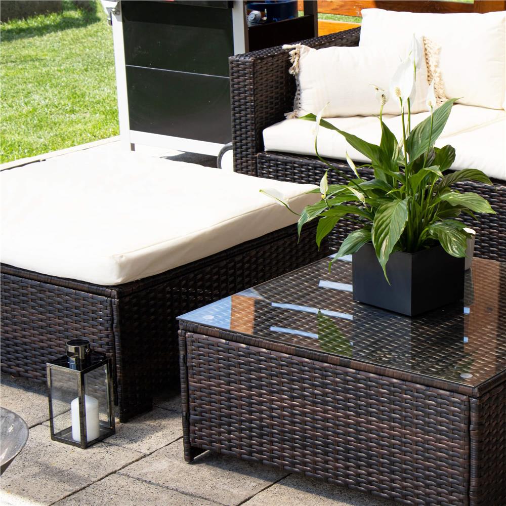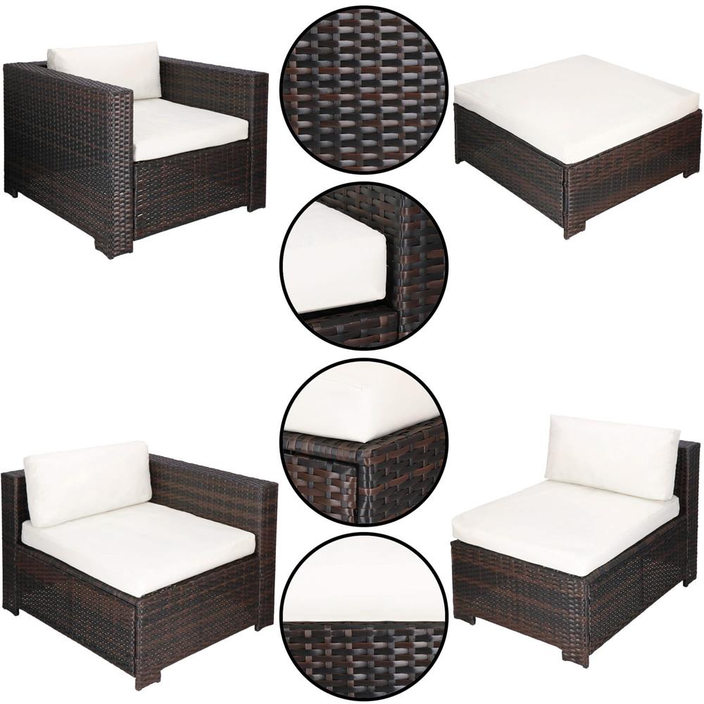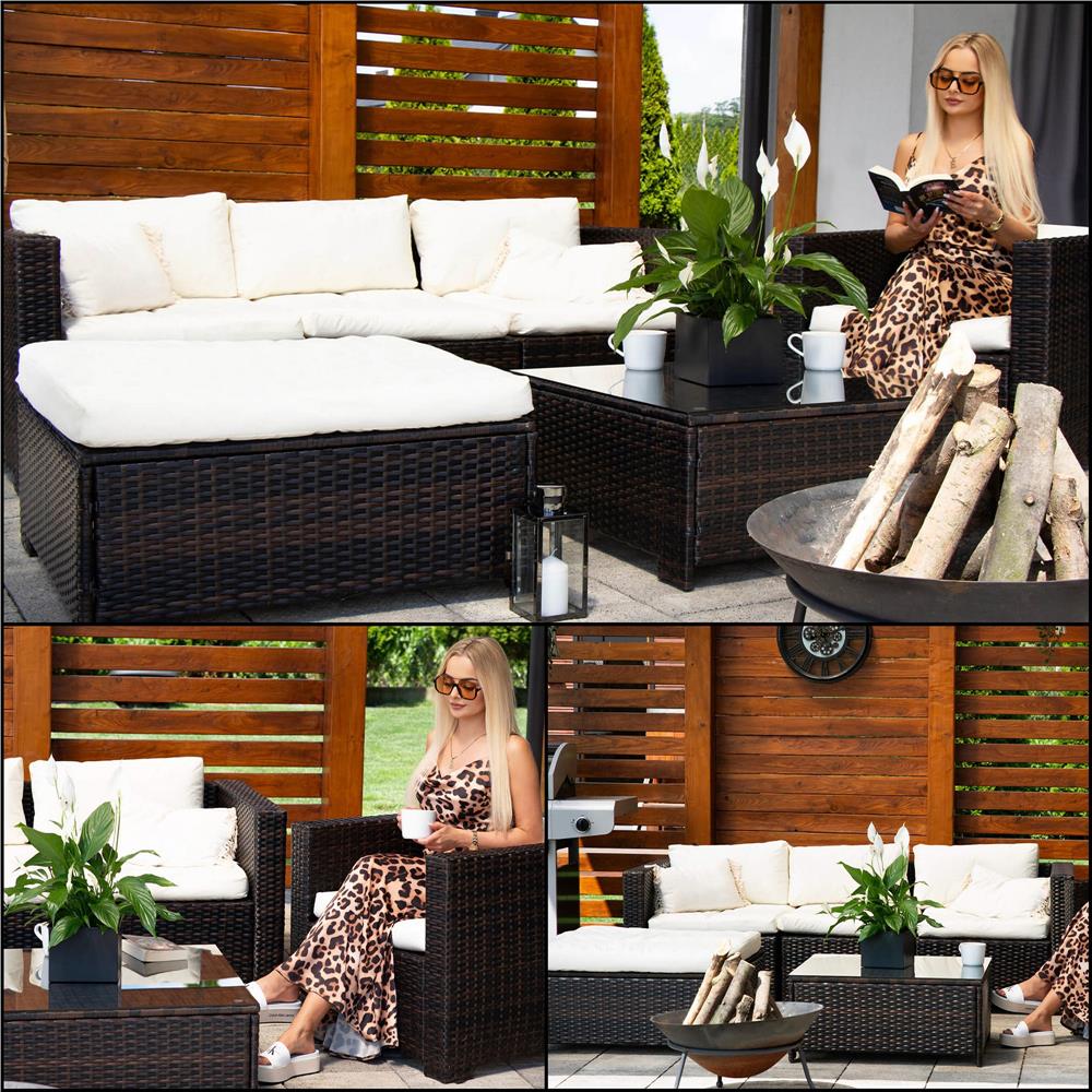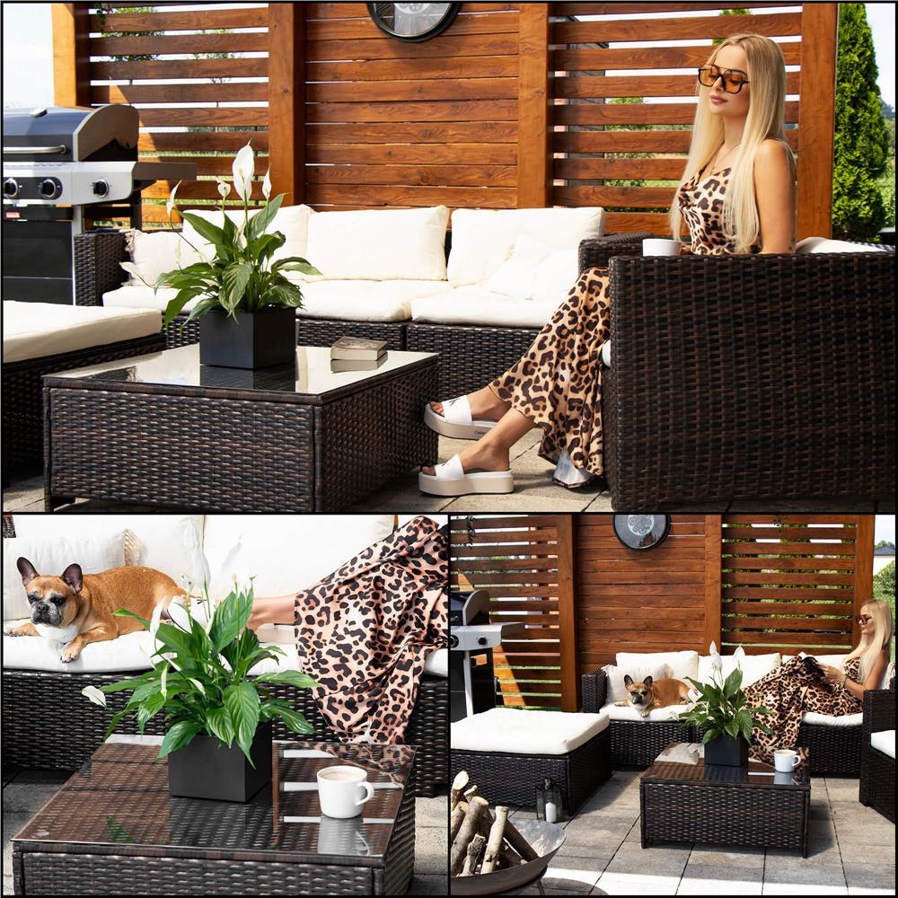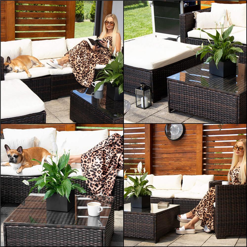 Specificatii tehnice Material: technorattan, sticla securizata, poliester, spuma PP Culoare: maro, crem Numar piese: 6 Dimensiuni module: Modul colt: 62 x 70 x 80 cm (H x L x A) Modul drept cu spatar: 62 x 60 x 80 cm Modul patrat: 33 x 79 x 79 cm Dimensiuni sezut: 60 x 70 cm, inaltime 32 cm Dimensiuni masa: 33.5 x 74 x 74 cm Blat sticla: 73.5 x 73.5 cm Grosime sticla: 5.5 mm Dimensiuni fotoliu: 62 x 80 x 80 cm Scurta descriere Setul de mobilier pentru gradina din technorattan este alegerea ideala pentru relaxare in aer liber. Designul modular permite configurarea flexibila in functie de spatiu, iar pernele confortabile si masa cu blat din sticla completeaza perfect zona de lounge. Este potrivit pentru terasa, gradina sau balcon. Caracteristici principale Design modern si elegant pentru exterior Structura din technorattan rezistent la intemperii Masa cu blat din sticla securizata Ideal pentru gradina, terasa sau balcon Usor de intretinut si curatat