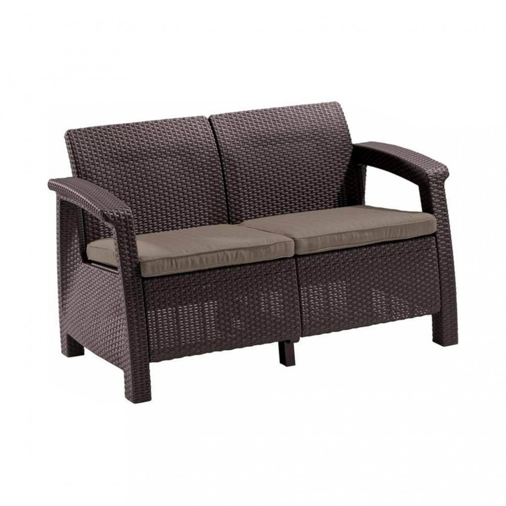 Set mobilier grădină Curver Corfu maro cu perne taupe, 4 piese (canapea, 2 fotolii, masă)