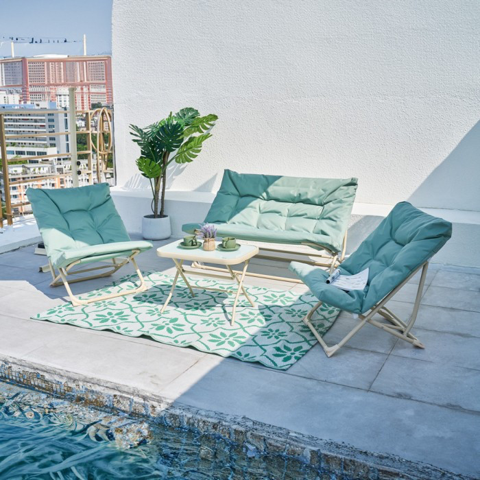 Masa cu blat din sticlă adaugă un aspect modern și se curăță rapid, iar piesele pliabile te ajută să economisești spațiu atunci când nu le folosești. Este un set practic pentru momentele de vară, de la cafeaua de dimineață până la serile petrecute afară cu familia.