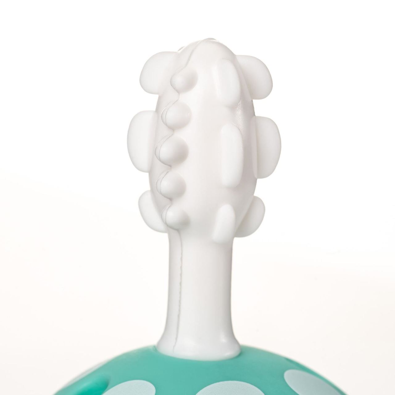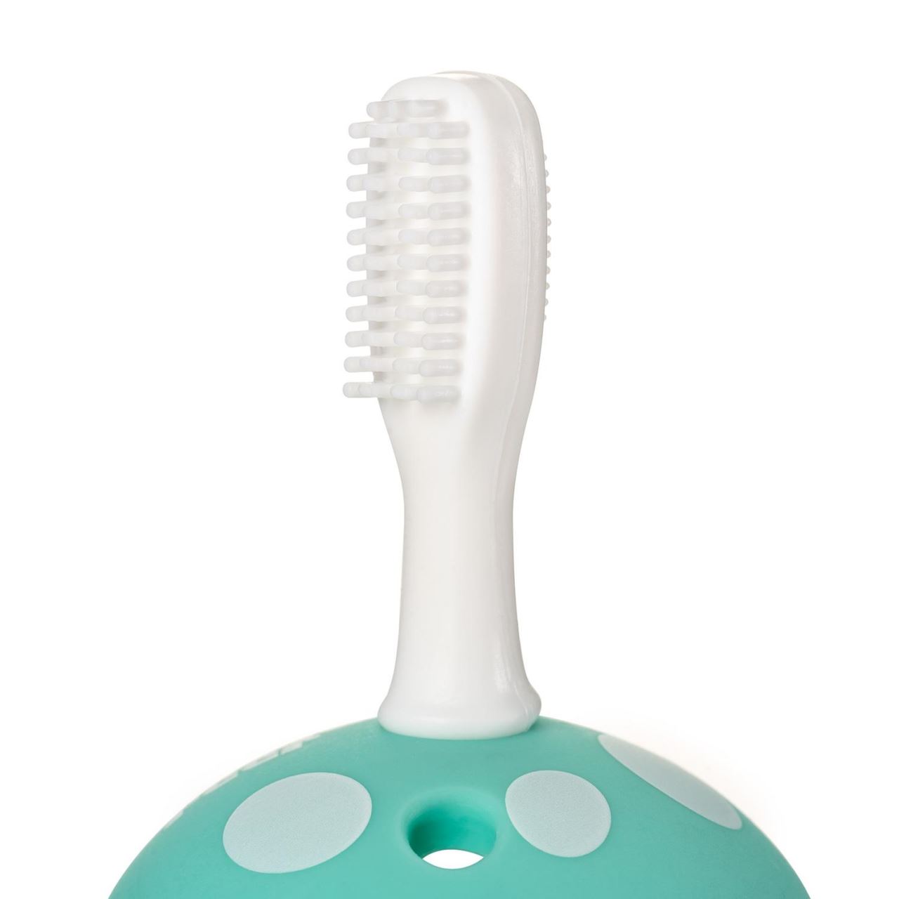 Set de ingrijire a dintilor in 2 etape format dintr-o periuta de dinti cu 2 terminatii: un cap de masaj care calmeaza durerea de dinti si o perie din silicon pentru ingrijirea primilor dinti mici. Recomandat de la 0 luni.