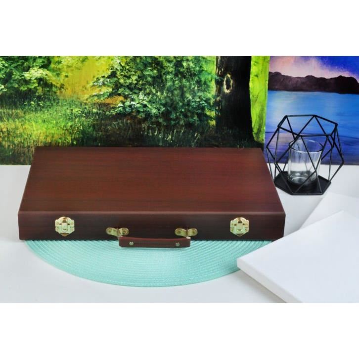 Totul este asezat intr-o valiza eleganta, pliabila, fabricata din lemn, ceea ce, fara indoiala, ii creste valoarea estetica si ii afecteaza si durabilitatea. Valiza are un maner durabil, din piele, confortabil, datorita caruia transportul intregului continut este simplu si, de asemenea, creste satisfactia la utilizare. Cataramele din metal, rezistente, garanteaza ca valiza va fi bine inchisa atunci cand o vei transporta si ca nu se va scurge nimic din ea sau nu vei pierde nimic.