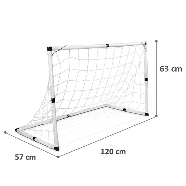 Cum se folosește: asamblează cadrul, fixează plasa, ancorează poarta cu piciorușele incluse, umflă mingea cu pompa și începe jocul. Recomandat a fi montat și utilizat sub supravegherea unui adult.