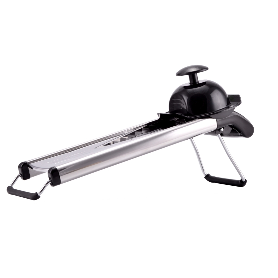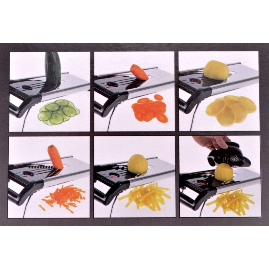 - Conținut: 1 suport pentru lamă; 3 inserții feliere (1,5 mm; 2,5 mm; 3,5 mm); 2 inserții julienne (3 mm; 7 mm); 1 protecție pentru degete