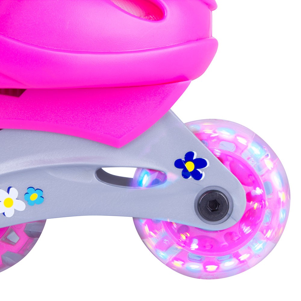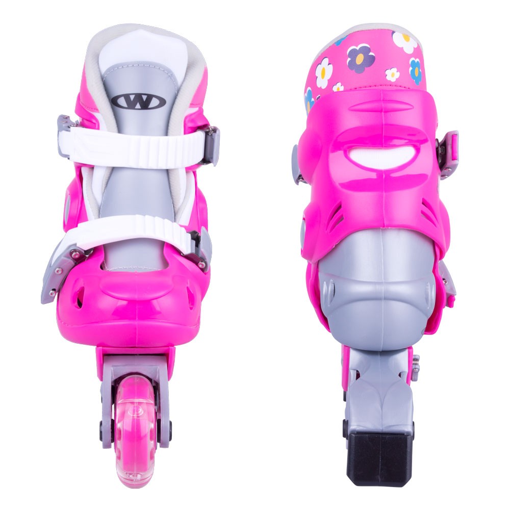Setul de role Worker Polly LED-cu roti iluminate indeplineste cele mai inalte standarde de siguranta. Conformitatea cu cerintele europene de siguranta (EN-71) a fost testata de catre organismul german TÜV-GS. Rolele sunt prevazute cu roti iluminate care se aprind atunci cand se rotesc. Cu toate acestea, nu sunt necesare baterii, deoarece diodele sunt alimentate de energia electromagnetica. Orice copil va fi incantat sa se joace cu ele. Deoarece include o casca, role si protectii pentru genunchi, coate si incheieturi, Setul de role Worker Polly LED-cu roti iluminate are tot ce ar putea avea nevoie micuta ta printesa.