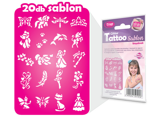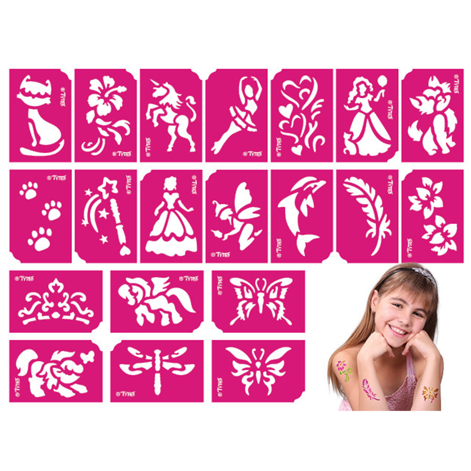 Setul de șabloane conține 21 de modele pentru fete de 3-8 ani, pe care le puteți folosi pentru tatuaje cu sclipici sau alte picturi corporale. Obțineți modele populare într-un singur pachet, cum ar fi un pisoi, un fluture sau un ponei, care cu siguranță le vor încânta pe fetițe.
