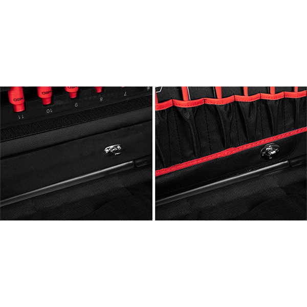 - 6 buc. clesti izolati (cleste universal de 200 mm, cleste indoit de 200 mm, cleste lateral de 180 mm, cleste plat de 160 mm, cleste pentru tevi de 250 mm, cleste pentru cabluri de 250 mm),"lama izolata