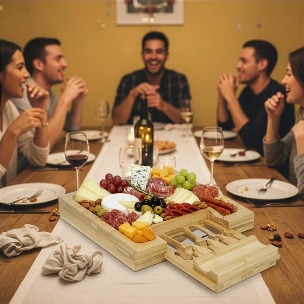 Set servire branzeturi din bambus cu sertar glisant, 5 piese, 33x33 cm