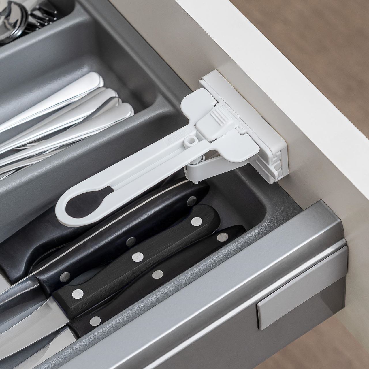 Se recomanda pentru sertare din bucatarie, sertare pentru tacamuri sau alte spatii unde sunt depozitate obiecte ce trebuie tinute departe de copii. Se instaleaza rapid cu ajutorul accesoriilor incluse in pachet.