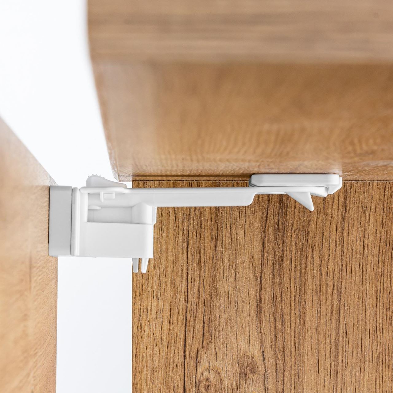 Set sigurante pentru sertare copii Reer, 2 bucati, alb, montaj adeziv sau surub