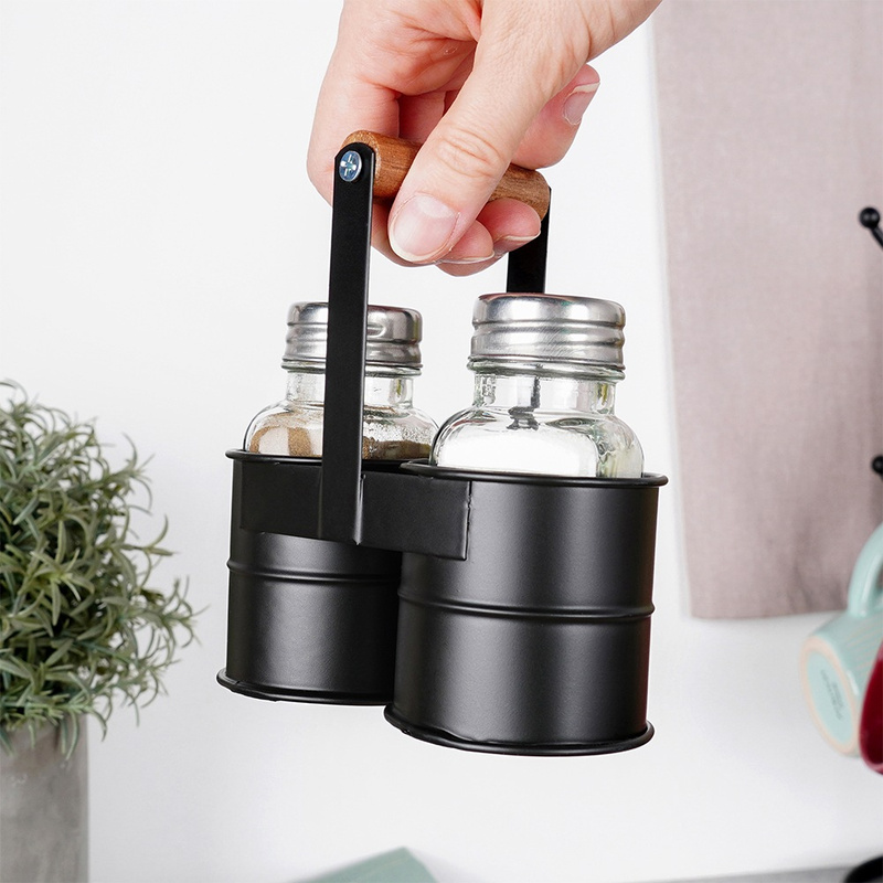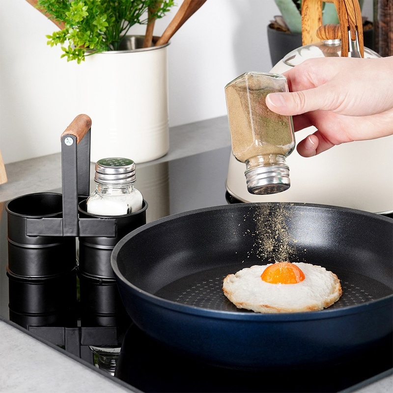 Utilizare: Umple recipientele cu sare și piper (sau alte condimente fine), închide capacele și așază-le în suport. Pentru servire, ridică ușor setul de mâner.