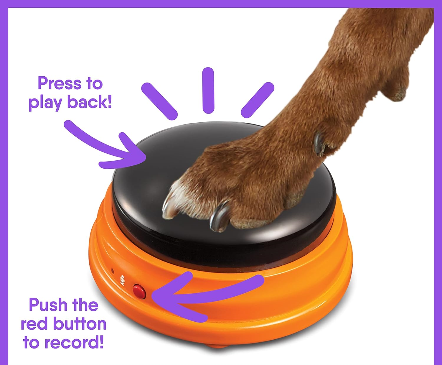 Pentru inregistrare, apasa si mentine butonul rosu lateral pana auzi semnalul sonor, apoi rosteste comanda dorita. Dupa eliberarea butonului, soneria salveaza mesajul, iar la apasare va reda cuvantul inregistrat. Poti folosi fiecare piesa pentru o actiune diferita, astfel incat procesul de dresaj interactiv pentru caini sa fie mai clar si mai eficient.