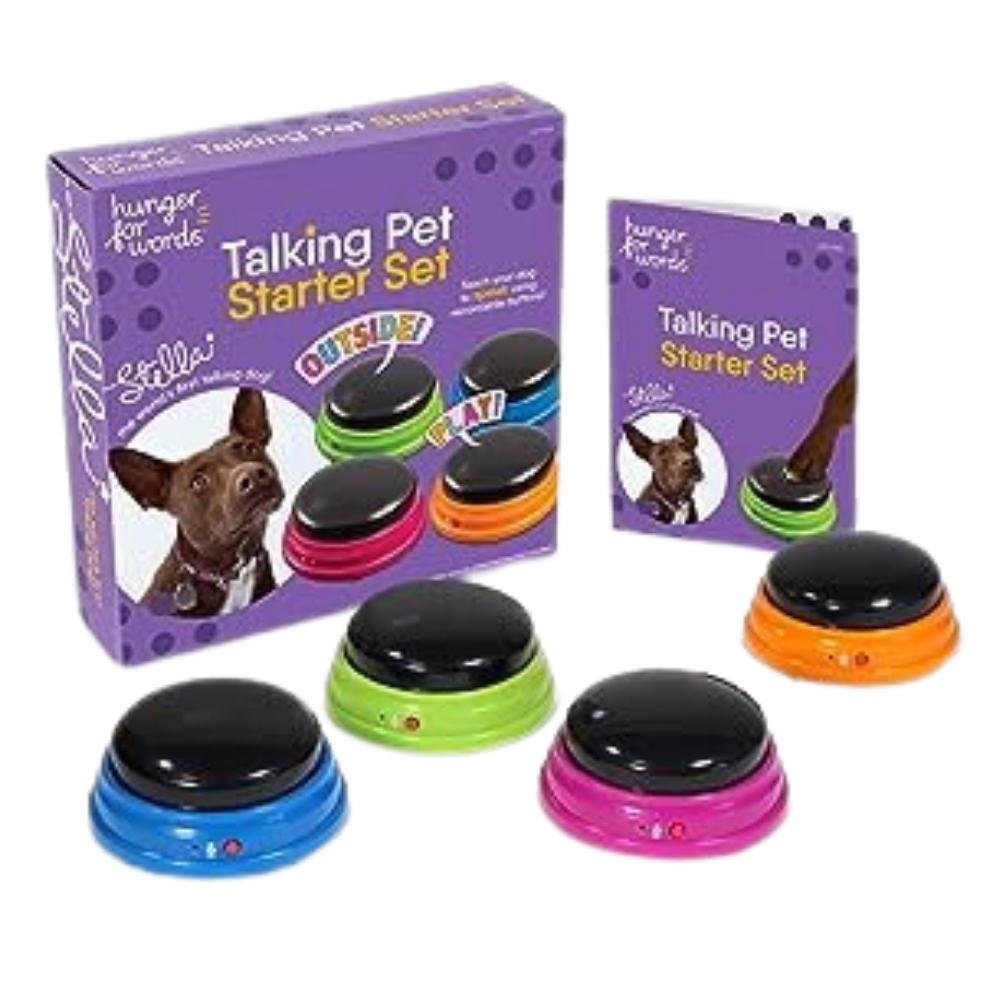 Ajuta-ti patrupedul sa comunice mai usor cu acest set sonerii pentru dresaj caini, ideal pentru antrenament acasa si invatarea comenzilor de baza. Fiecare sonerie permite inregistrare vocala, astfel incat poti seta cuvinte simple precum „mancare”, „afara”, „joaca” sau „culcare”. Este o solutie practica si interactiva pentru o relatie mai buna intre tine si cainele tau.