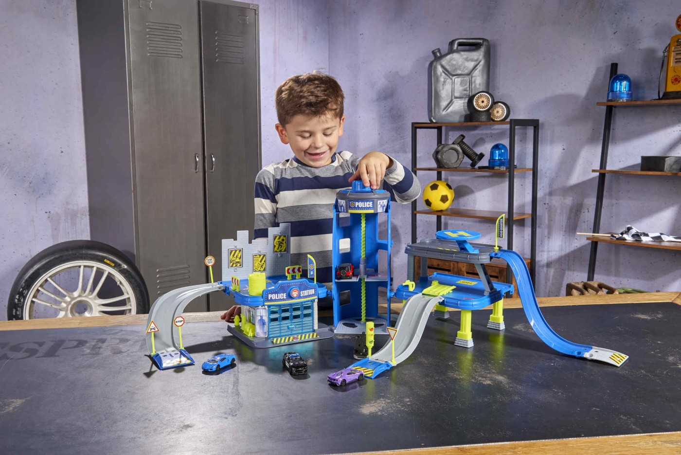 - Include 5 mașinuțe: Porsche Panamera Police, Audi R8 Spyder, Ford GT, Lamborghini Aventador și Jeep Wrangler