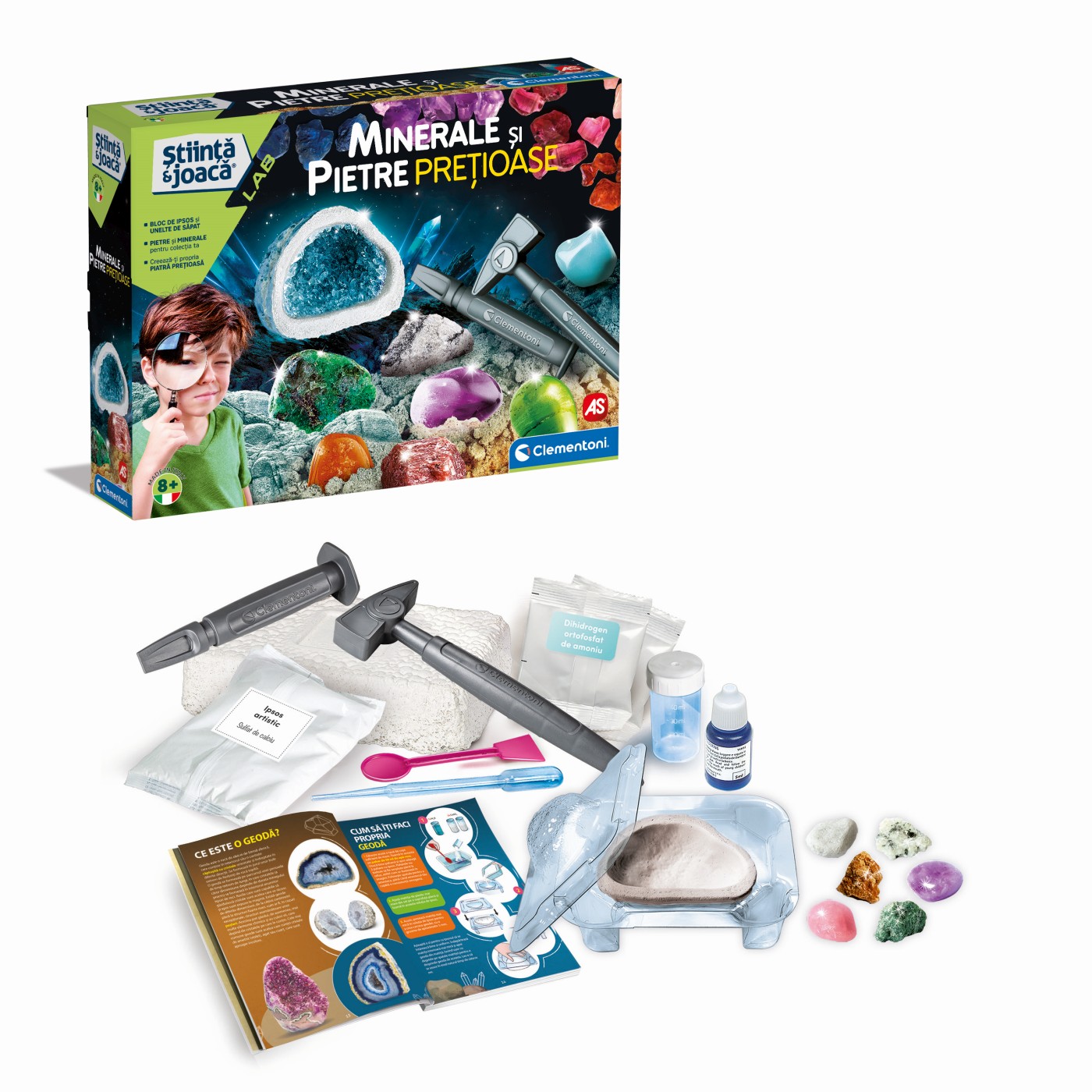 Transformă joaca într-o aventură educativă cu acest set științific cu minerale și pietre prețioase, creat pentru copiii pasionați de descoperiri, colecții și experimente. Cei mici pot săpa în blocul de ipsos pentru a găsi pietre și minerale, apoi își pot crea propria geodă cu cristale, într-un mod distractiv și captivant.