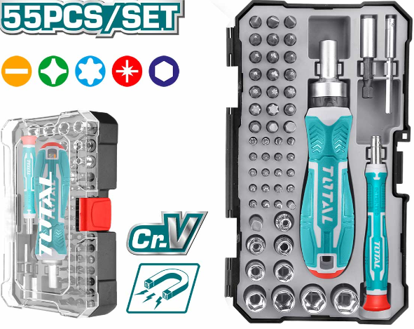 Set șurubelniță cu clichet TOTAL, 55 piese Cr-V, biți și tubulare în cutie