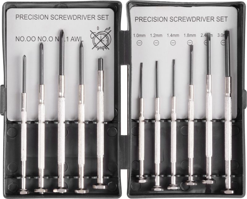 - 6x șurubelnițe drepte (PL): 1.0 mm, 1.2 mm, 1.8 mm, 2.0 mm, 2.4 mm, 3.0 mm