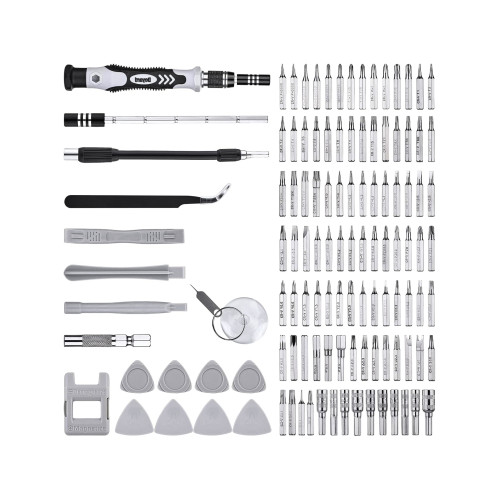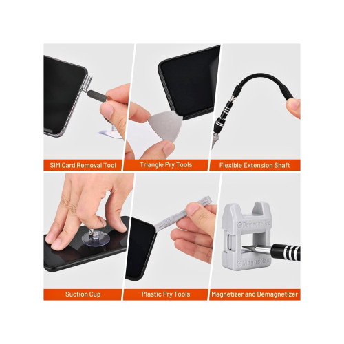 - Accesorii incluse: penseta cu varf ascutit, magnetizator/demagnetizator, ventuza, pin card SIM, extensie flexibila, tub extensie, maner telescopic, unelte deschidere carcase