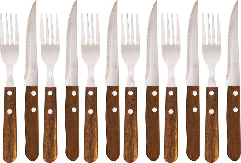 Setul de tacamuri pentru friptura Strend Pro Grill este alegerea potrivita pentru mese in familie, gratare in curte si servirea eleganta a preparatelor din carne. Conceput pentru 6 persoane, setul include cutite si furculite create pentru taierea usoara a steak-ului si a altor tipuri de carne. Combinatia dintre otel inoxidabil si manerele din lemn ofera un aspect rustic placut si o utilizare confortabila.
