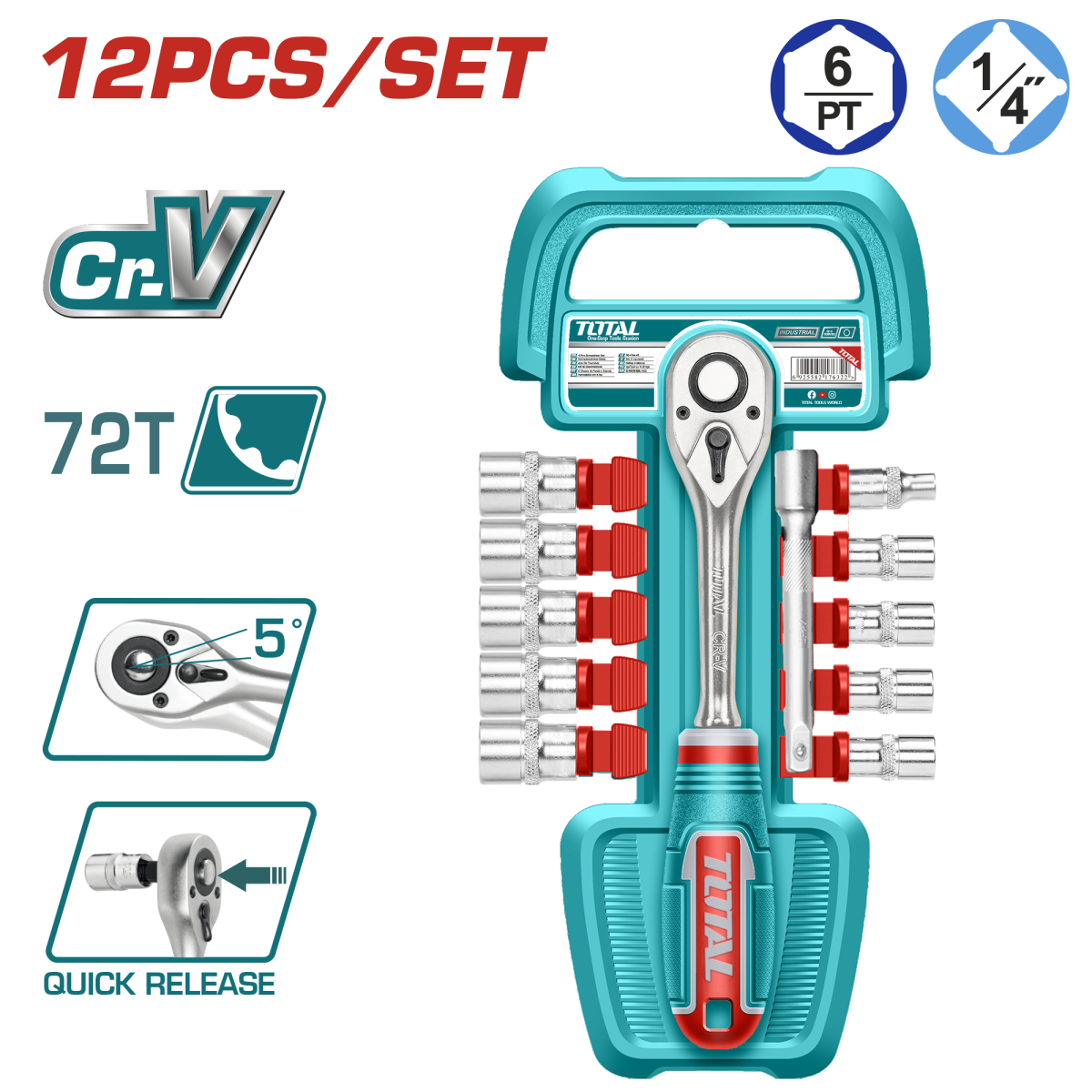 Set tubulare TOTAL 1/4 cu clichet si extensie, 12 piese, otel Cr-V