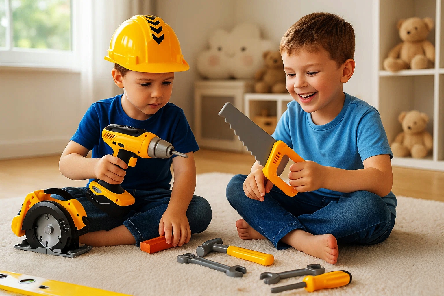 - Copilul poate folosi bormasina si fierastraul de jucarie in scenarii de constructie si reparatii