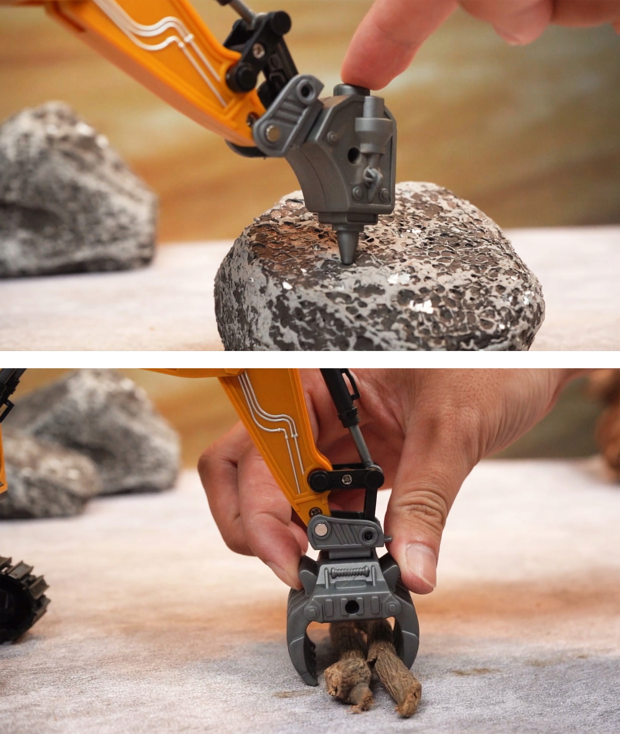- Alege accesoriul dorit pentru excavator: cupă, clește sau ciocan pneumatic
