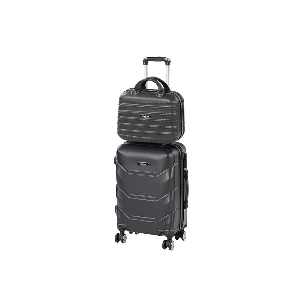 Calatoreste mai simplu cu setul de valize cu role Leziter TraveLux Max II, in nuanta neagra cu nervuri: primesti o valiza de cabina si un bagaj de mana compact, perfecte pentru city break-uri, zboruri low-cost si deplasari de business. Carcasa din ABS rezistent la zgarieturi protejeaza continutul, iar designul practic iti tine lucrurile in ordine.