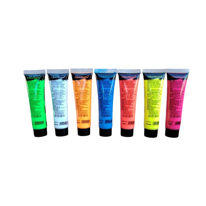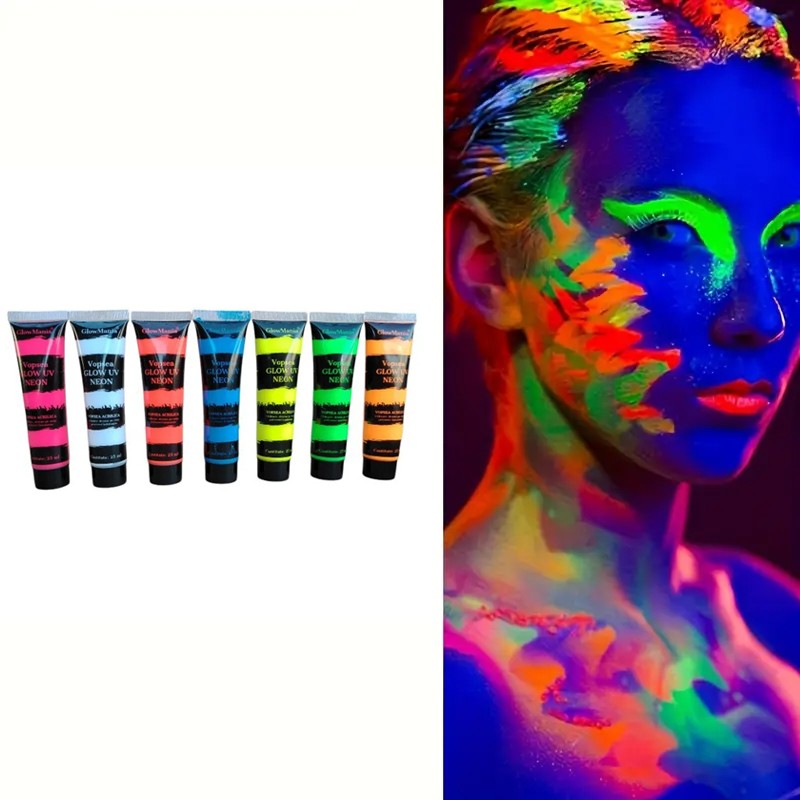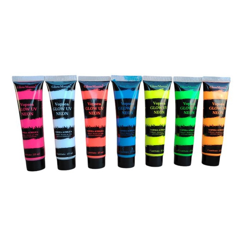 Set vopsea UV neon glow 7 culori pentru fata si corp, 25 ml/culoare