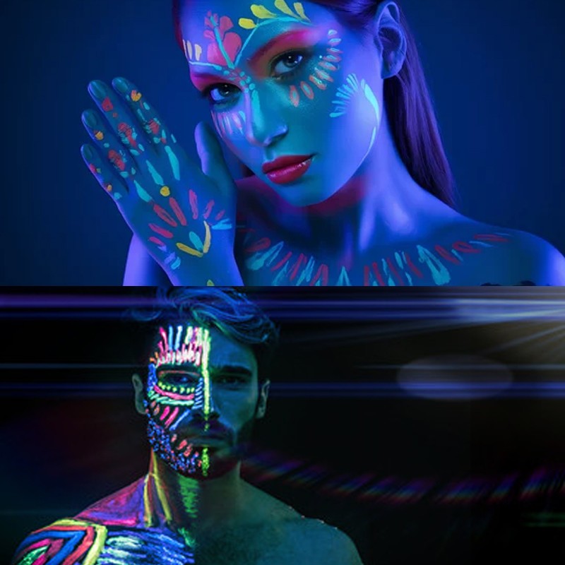 Cum se foloseste: aplica un strat subtire pe pielea curata si uscata. Pentru un efect mai intens, adauga un al doilea strat dupa uscare. Pentru cel mai bun rezultat, foloseste o lampa UV/blacklight in timpul evenimentului.