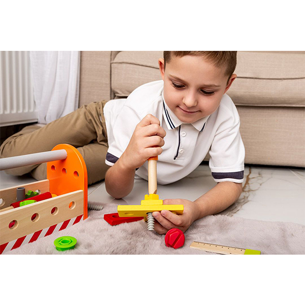 - Copilul mic isi exerseaza coordonarea motorie, invata numele si utilizarile uneltelor de atelier de baza sau invata cum sa potriveasca piesele individuale. Setul de scule dezvolta, de asemenea, imaginatia si permite jocul in grup (cu fratii mai mari sau cu ingrijitorii)