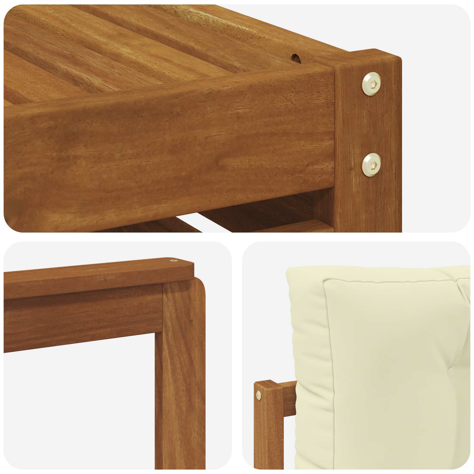 Setul de mobilă pentru exterior aduce împreună stilul și funcționalitatea, transformându-ți grădina sau terasa într-un loc de relaxare. Designul său modern cu linii simple și detalii subtile ajută la crearea unei atmosfere elegante, perfectă pentru petreceri în aer liber. Tot din lemn masiv de acacia, setul e durabil și arată bine pe termen lung, ideal pentru cei care caută mobilier practic, dar și rafinat.