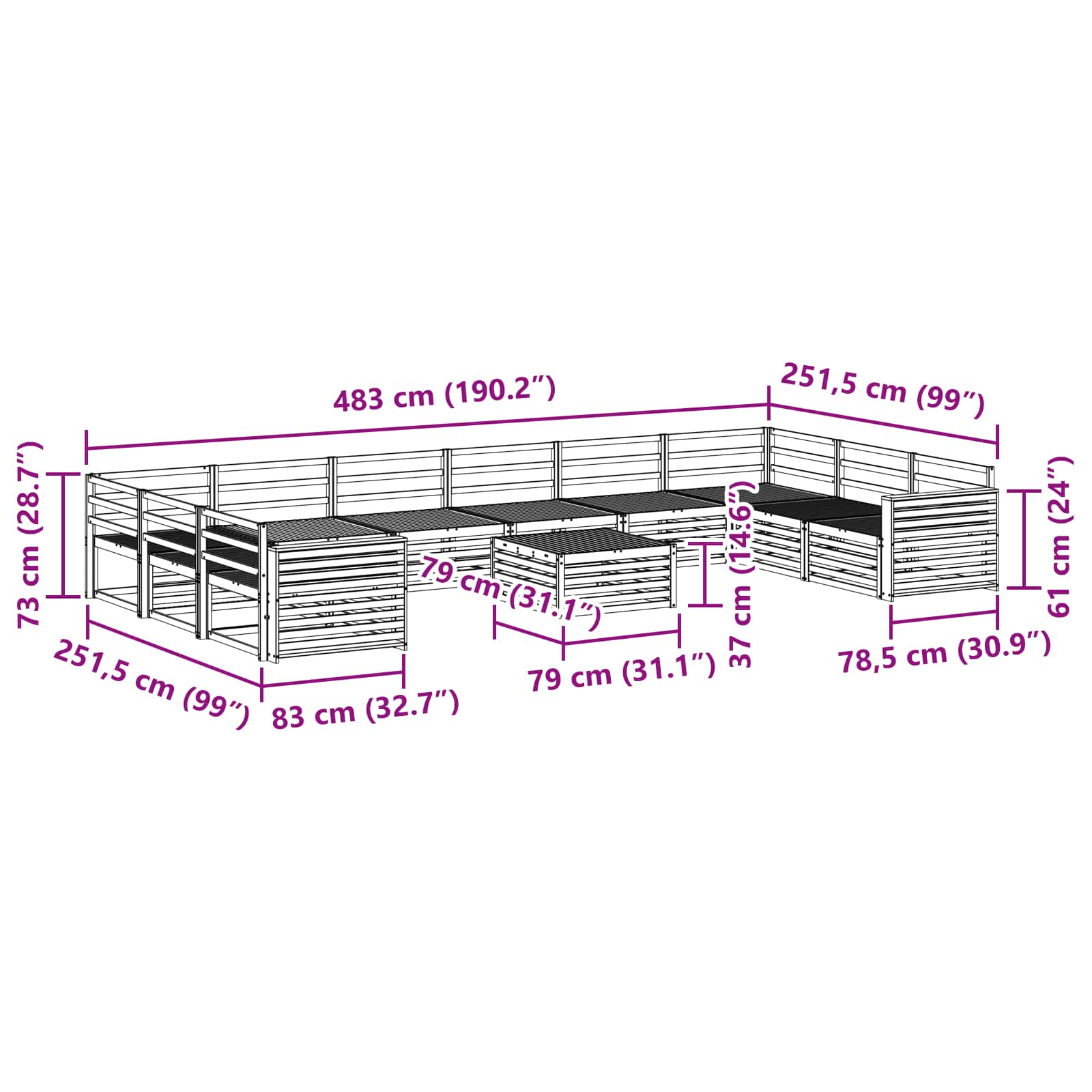 - 8 x canapea mediană: 83 x 79 x 73 cm (LxWxH)