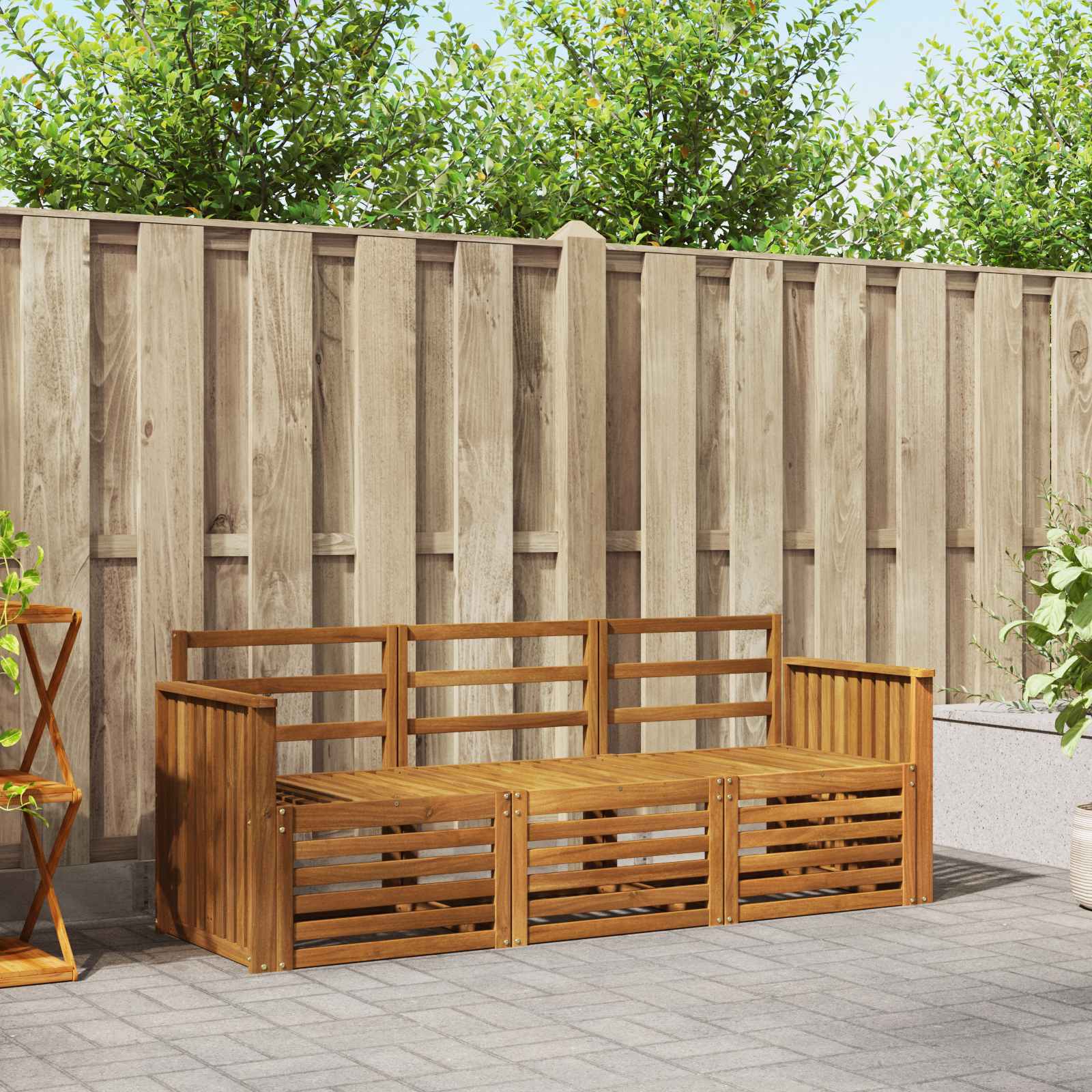 - Componente incluse: Setul include elemente modulare care permit aranjamente flexibile. Brațele și cadrele din lemn masiv de acacia adaugă durabilitate, având totodată un aspect uniform pentru momente sociabile în aer liber.