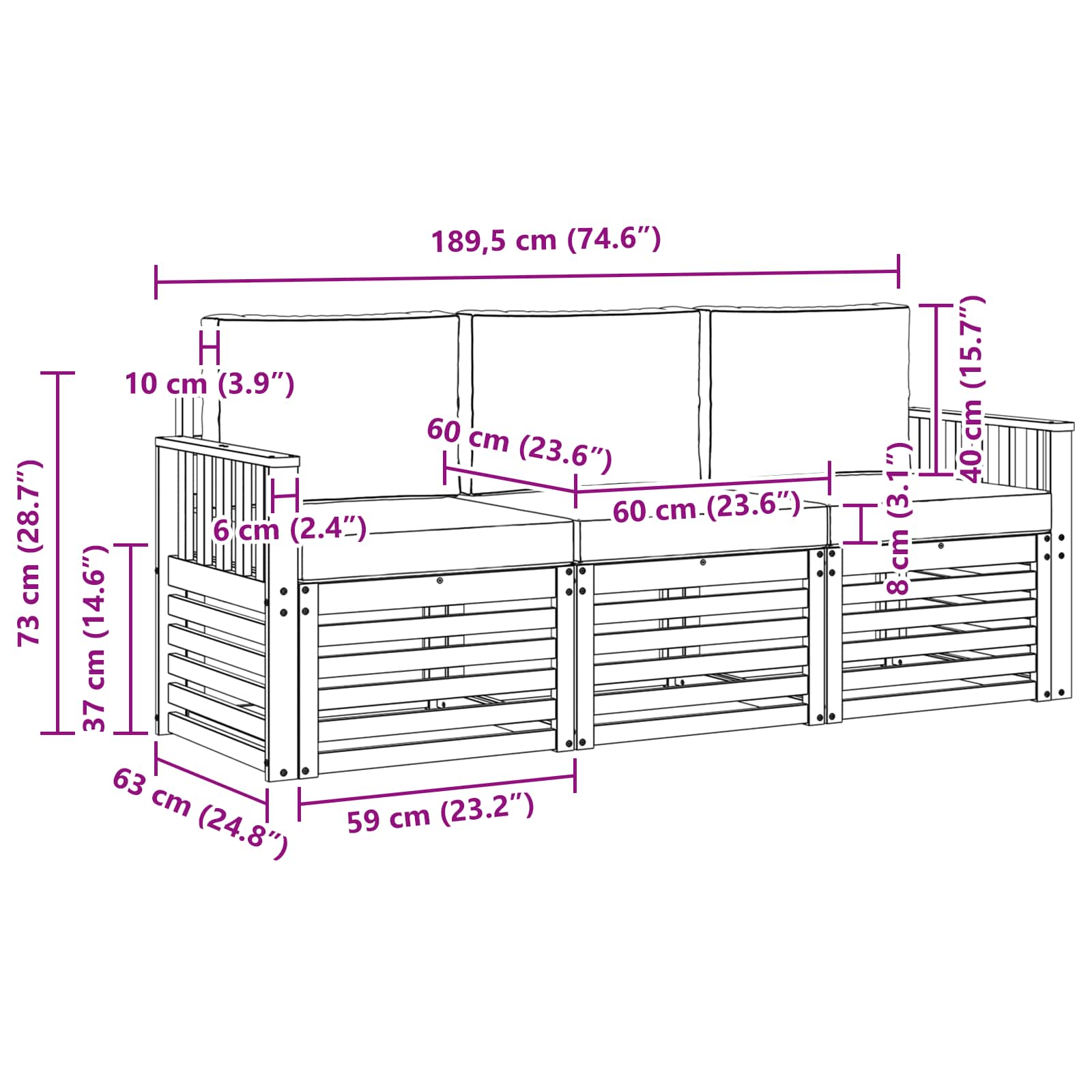 - 3 x Canapea mijlocie: 63 x 59 x 73 cm (LxWxH)